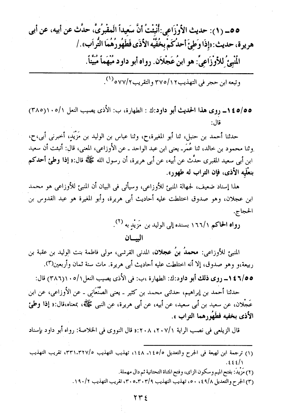 55- (1): حديث الأوزاعي: أنبئت أن سعيداً المقبري، حدث عن أبيه، عن أبي هريرة، حديث: ((إذا وطئ أحدكم بخفيه الأذى فطهورهما التراب)).