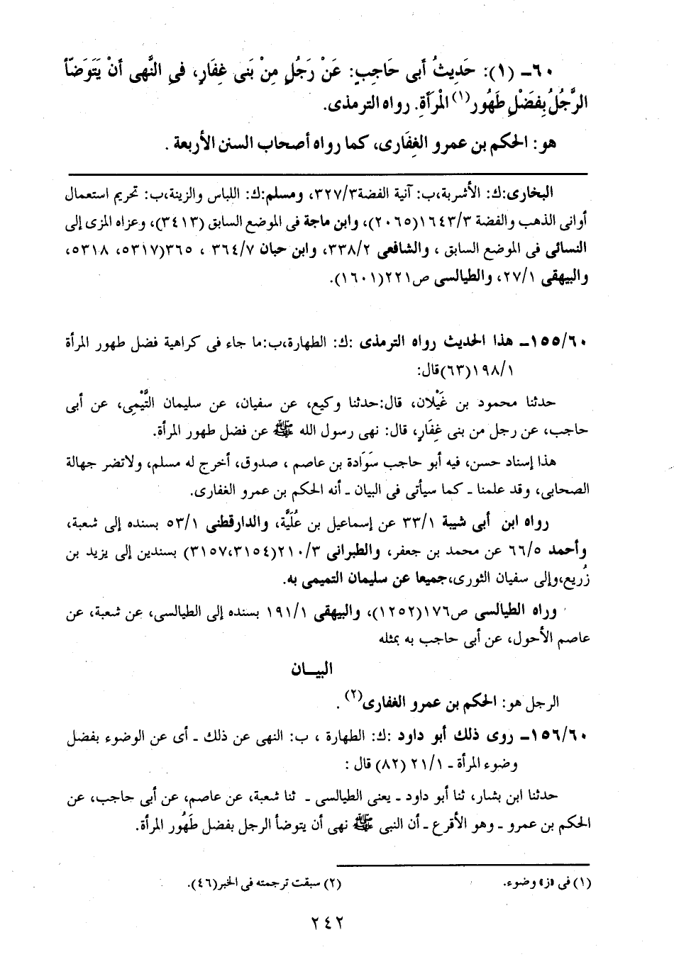 60- (1): حديث أبي حاجبٍ: عن رجلٍ من بني غفارٍ، في النهي أن يتوضأ الرجل بفضل طهور المرأة. رواه الترمذي.