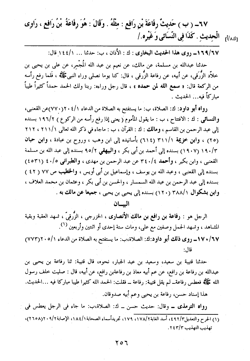 67- (ب): حديثٌ رفاعة بن رافعٍ: مثله. وقال: هو رفاعة بن رافع، راوي الحديث. كذا في النسائي وغيره.