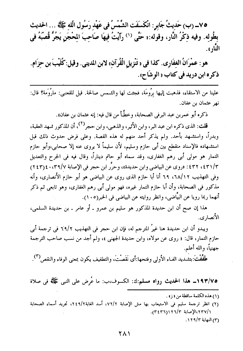 75- (ب): حديث جابرٍ: انكسفت الشمس في عهد رسول الله صلى الله عليه وسلم .. .. الحديث بطوله. وفيه ذكر النار، وقوله: ((حتى رأيت فيها صاحب المحجن يجر قصبه في النار)).