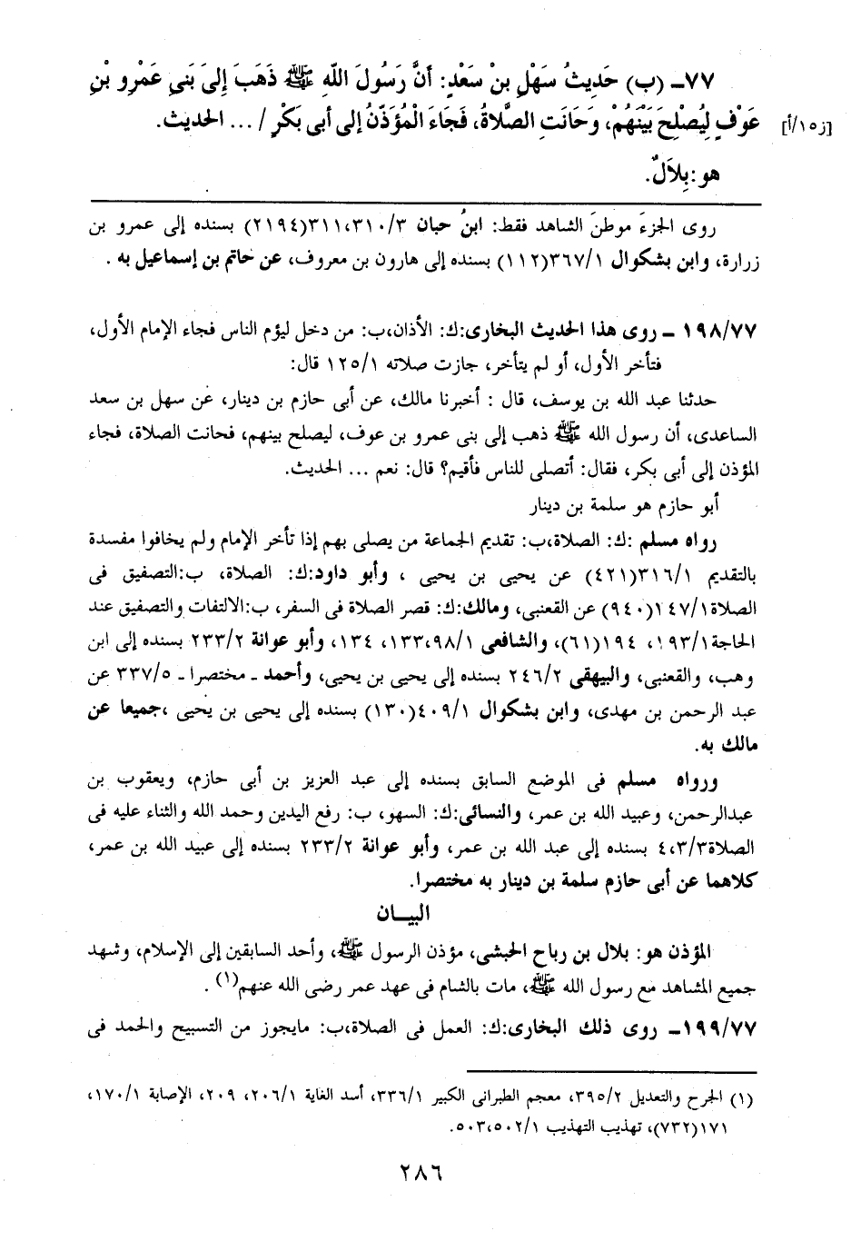 77- (ب): حديث سهل بن سعدٍ: أن رسول الله صلى الله عليه وسلم ذهب إلى بني عمرو بن عوفٍ ليصلح بينهم، وحانت الصلاة، فجاء المؤذن إلى أبي بكرٍ .. .. الحديث.