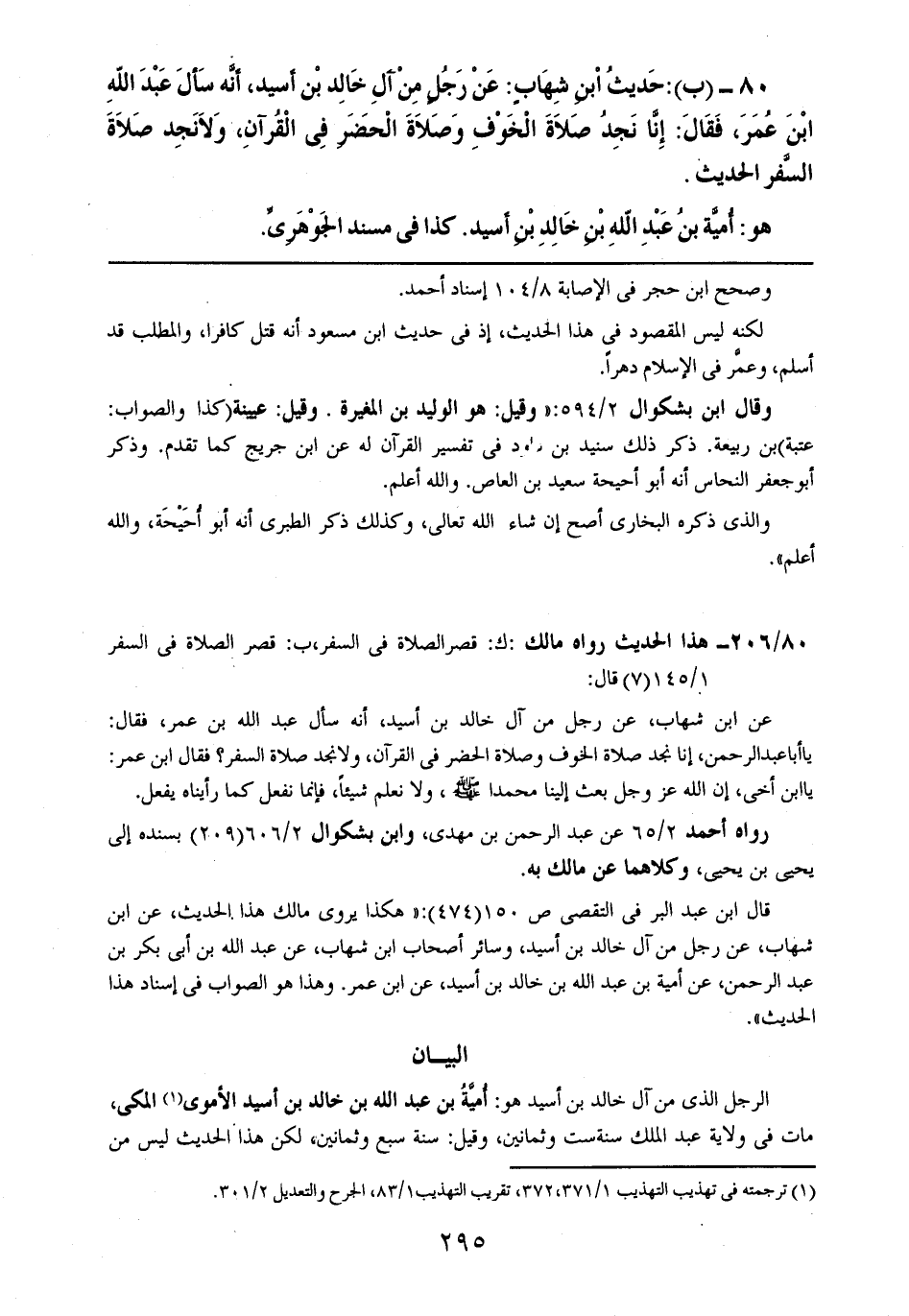 80- (ب): حديث ابن شهابٍ: عن رجلٍ من آل خالد بن أسيد، أنه سأل عبد الله ابن عمر، فقال: إنا نجد صلاة الخوف وصلاة الحضر في القرآن، ولا نجد صلاة السفر الحديث.
