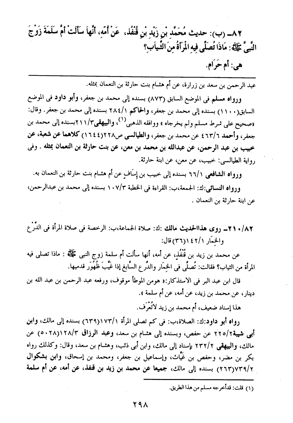 82- (ب): حديث محمد بن زيد بن قنفذ، عن أمه، أنها سألت أم سلمة زوج النبي صلى الله عليه وسلم: ماذا تصلي فيه المرأة من الثياب؟
