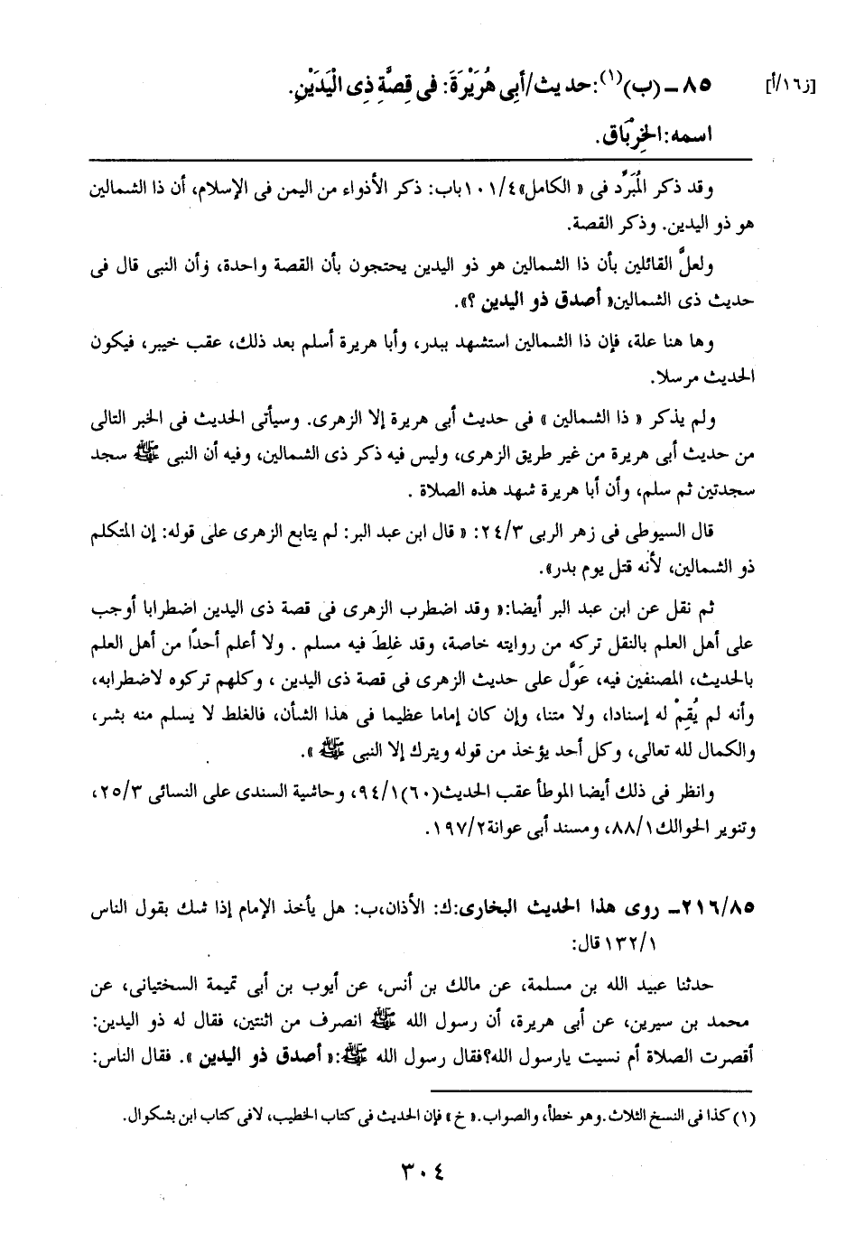 85- (ب): حديث أبي هريرة: في قصة ذي اليدين.