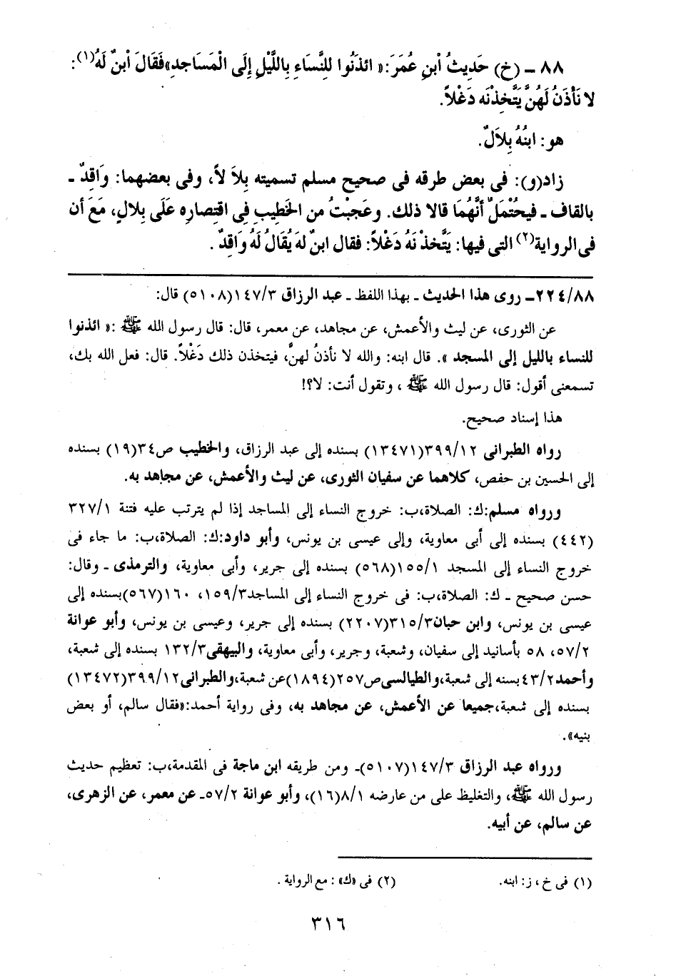 88- (خ): حديث ابن عمر: ((ائذنوا للنساء بالليل إلى المساجد)) فقال ابنٌ له: لا نأذن لهن يتخذنه دغلاً.