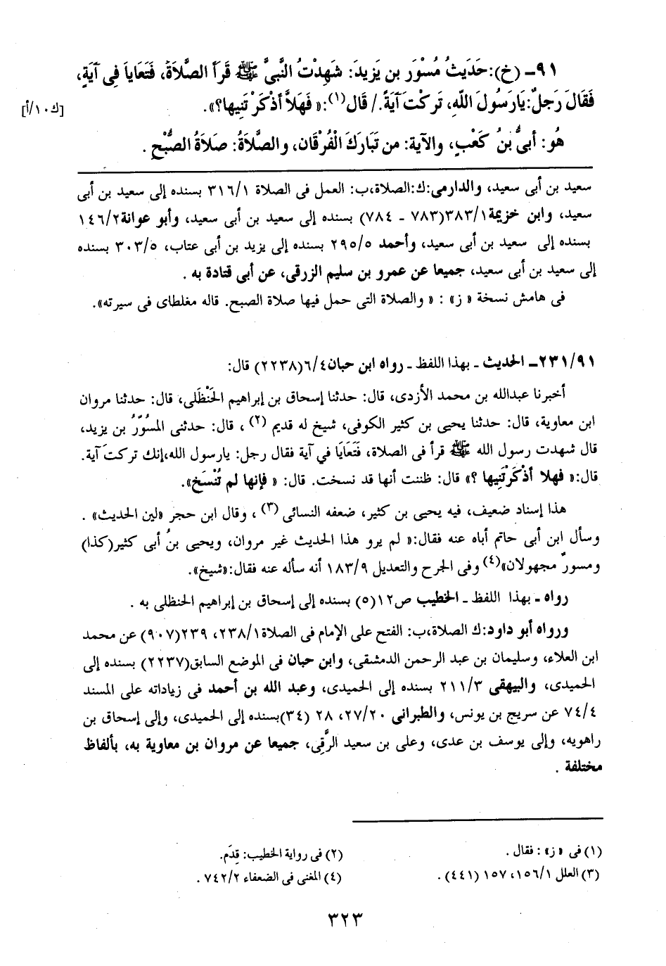 91- (خ): حديث مسور بن يزيد: شهدت النبي صلى الله عليه وسلم قرأ الصلاة، فتعايا في آيةٍ، فقال رجلٌ: يا رسول الله، تركت آيةً. قال: ((فهلا أذكرتنيها؟)).