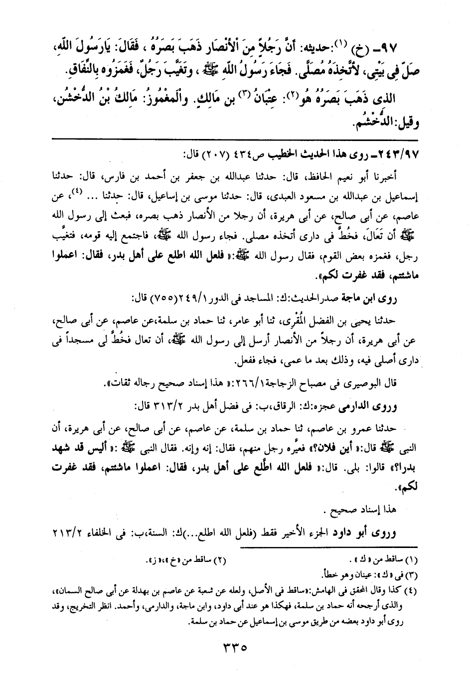 97- (خ): حديثه: أن رجلاً من الأنصار ذهب بصره، فقال: يا رسول الله، صل في بيتي، لأتخذه مصلى. فجاء رسول الله صلى الله عليه وسلم، وتغيب رجلٌ، فغمزوه بالنفاق.
