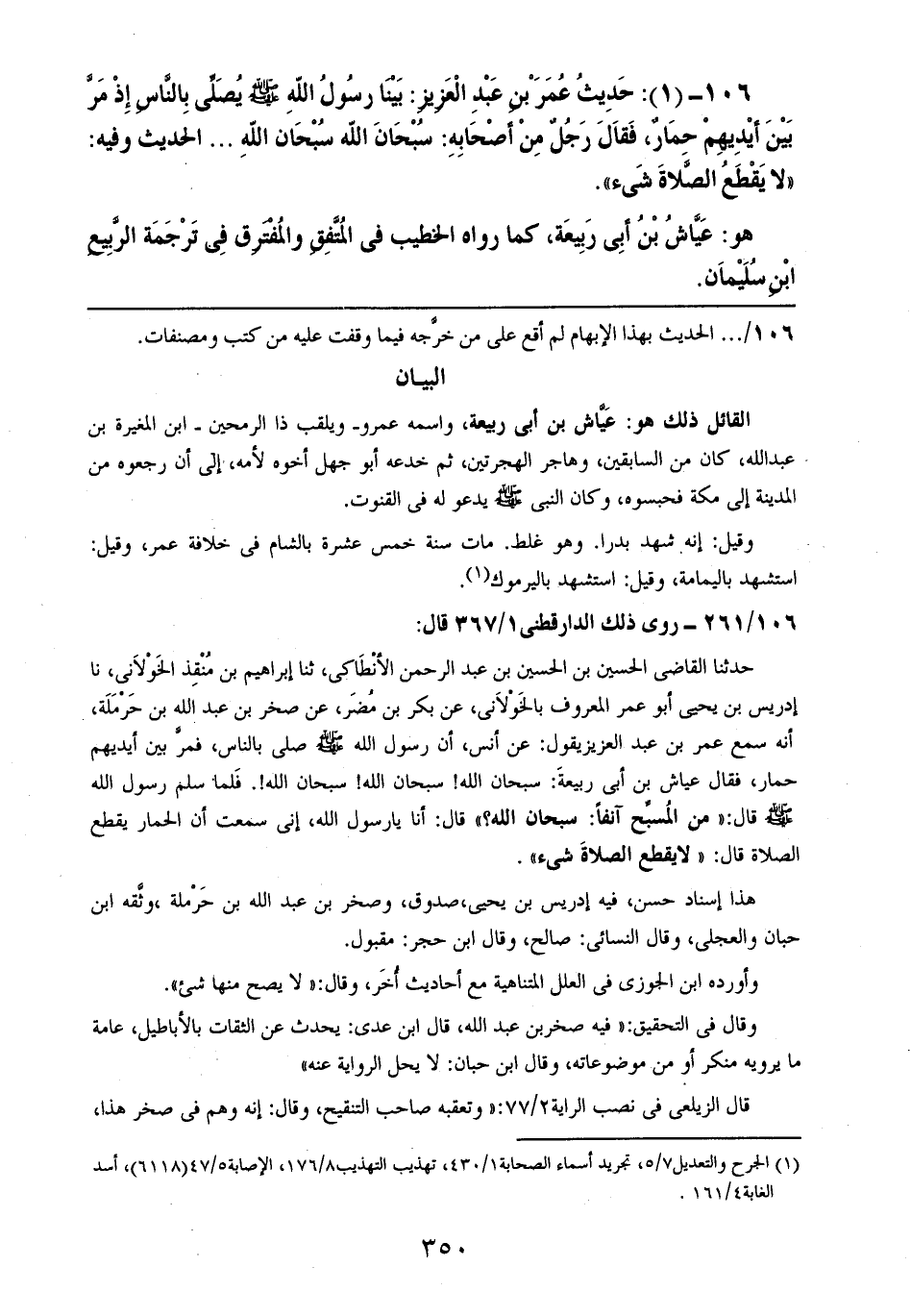 106- (1): حديث عمر بن عبد العزيز: بينا رسول الله صلى الله عليه وسلم يصلي بالناس إذ مر بين أيديهم حمارٌ، فقال رجلٌ من أصحابه: سبحان الله سبحان الله .. .. الحديث وفيه: ((لا يقطع الصلاة شيء)).