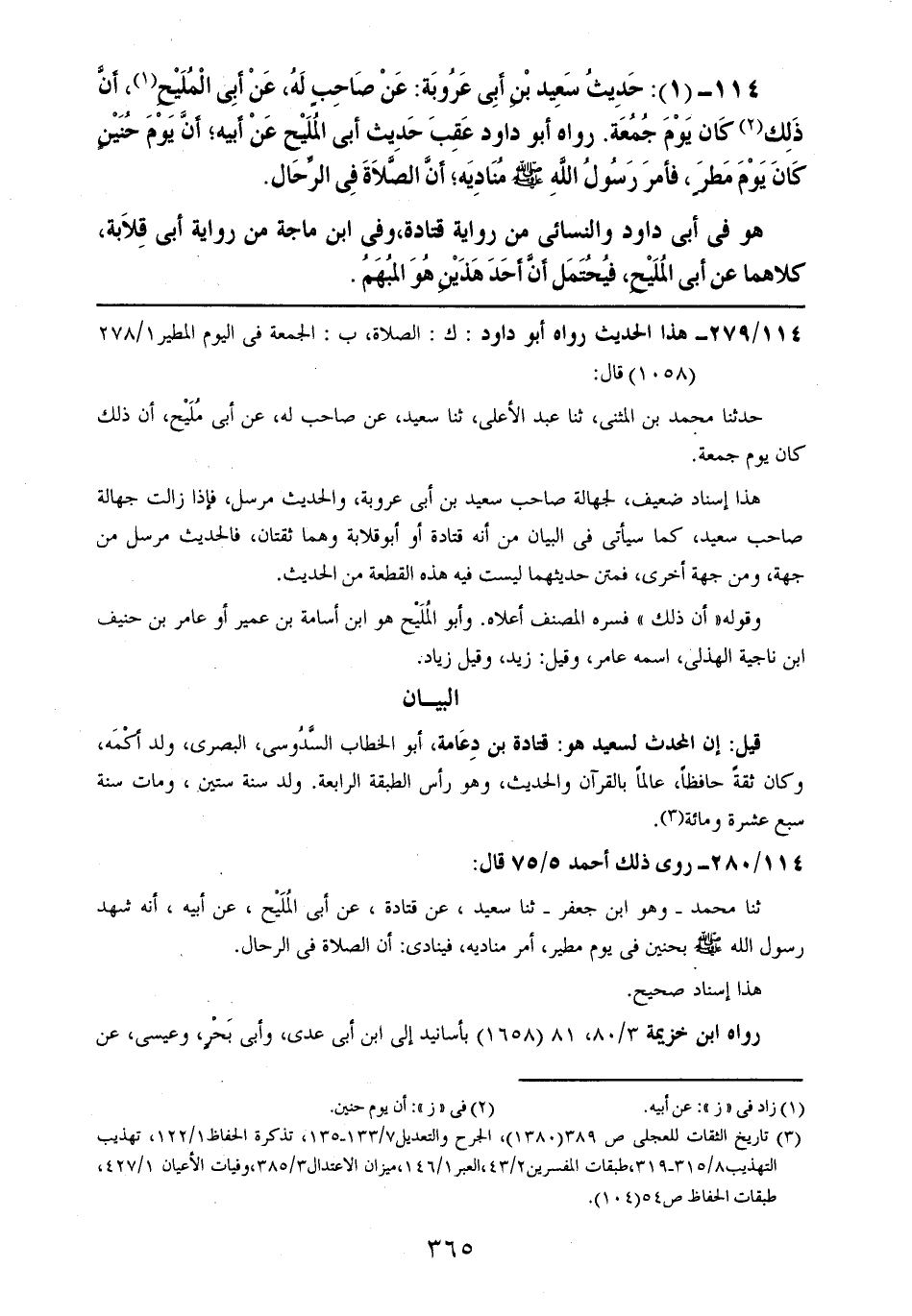 114- (1): حديث سعيد بن أبي عروبة: عن صاحبٍ له، عن أبي المليح، أن ذلك كان يوم جمعة. رواه أبو داود عقب حديث أبي المليح عن أبيه؛ أن يوم حنينٍ كان يوم مطرٍ، فأمر رسول الله صلى الله عليه وسلم مناديه؛ أن الصلاة في الرحال.
