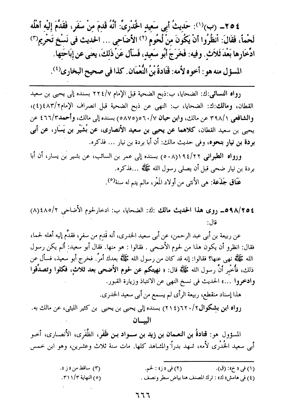 254- (ب): حديث أبي سعيد الخدري: أنه قدم من سفرٍ، فقدم إليه أهله لحماً، فقال: انظروا أن يكون من لحوم الأضاحي .. .. الحديث في نسخ تحريم ادخارها بعد ثلاثٍ. وفيه: فخرج أبو سعيدٍ، فسأل عن ذلك، يعني عن إباحتها.