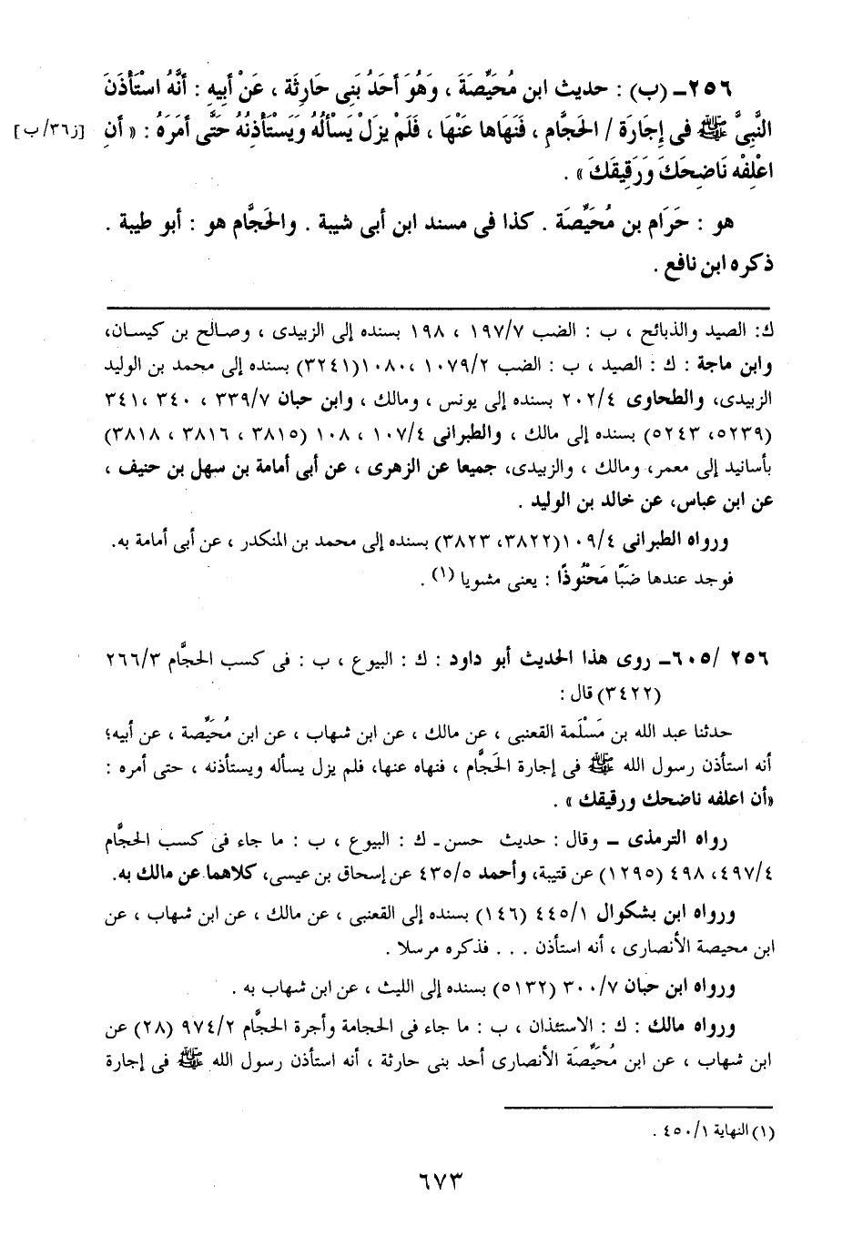 256- (ب): حديث ابن محيصة، وهو أحد بني حارثة، عن أبيه: أنه استأذن النبي صلى الله عليه وسلم في إجارة الحجام، فنهاها عنها، فلم يزل يسأله ويستأذنه حتى أمره: ((أن اعلفه ناضحك ورقيقك)).