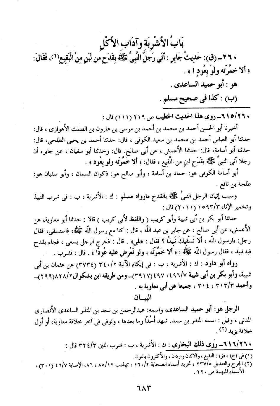 260- (ق): حديث جابرٍ: أتى رجل النبي صلى الله عليه وسلم بقدحٍ من لبنٍ من البقيع، فقال: ((ألا خمرته ولو بعودٍ!)).