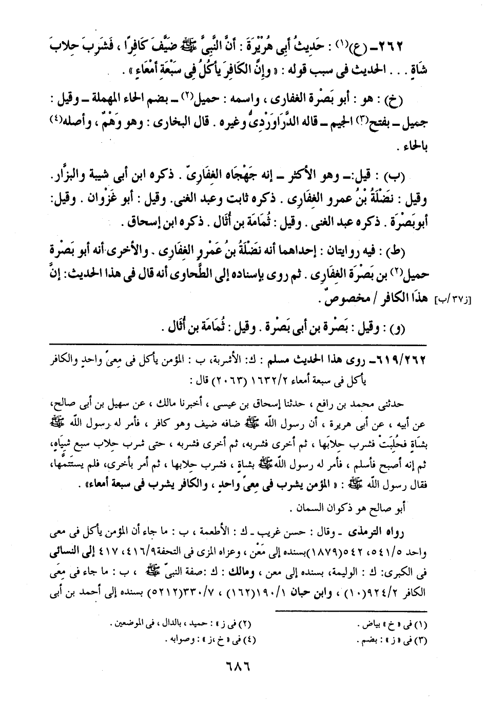 262- (ع): حديث أبي هريرة: أن النبي صلى الله عليه وسلم ضيف كافراً، فشرب حلاب شاةٍ .. .. الحديث في سبب قوله: ((وإن الكافر يأكل في سبعة أمعاءٍ)).