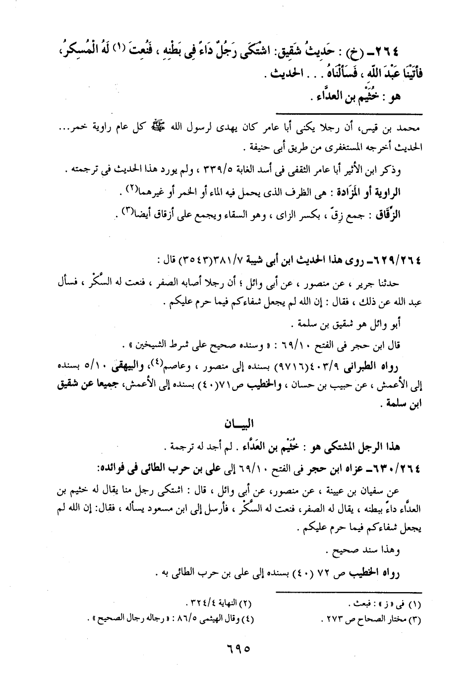 264- (خ): حديث شقيق: اشتكى رجلٌ داءٌ في بطنه. فنعت له المسكر، فأتينا عبد الله، فسألناه .. .. الحديث.