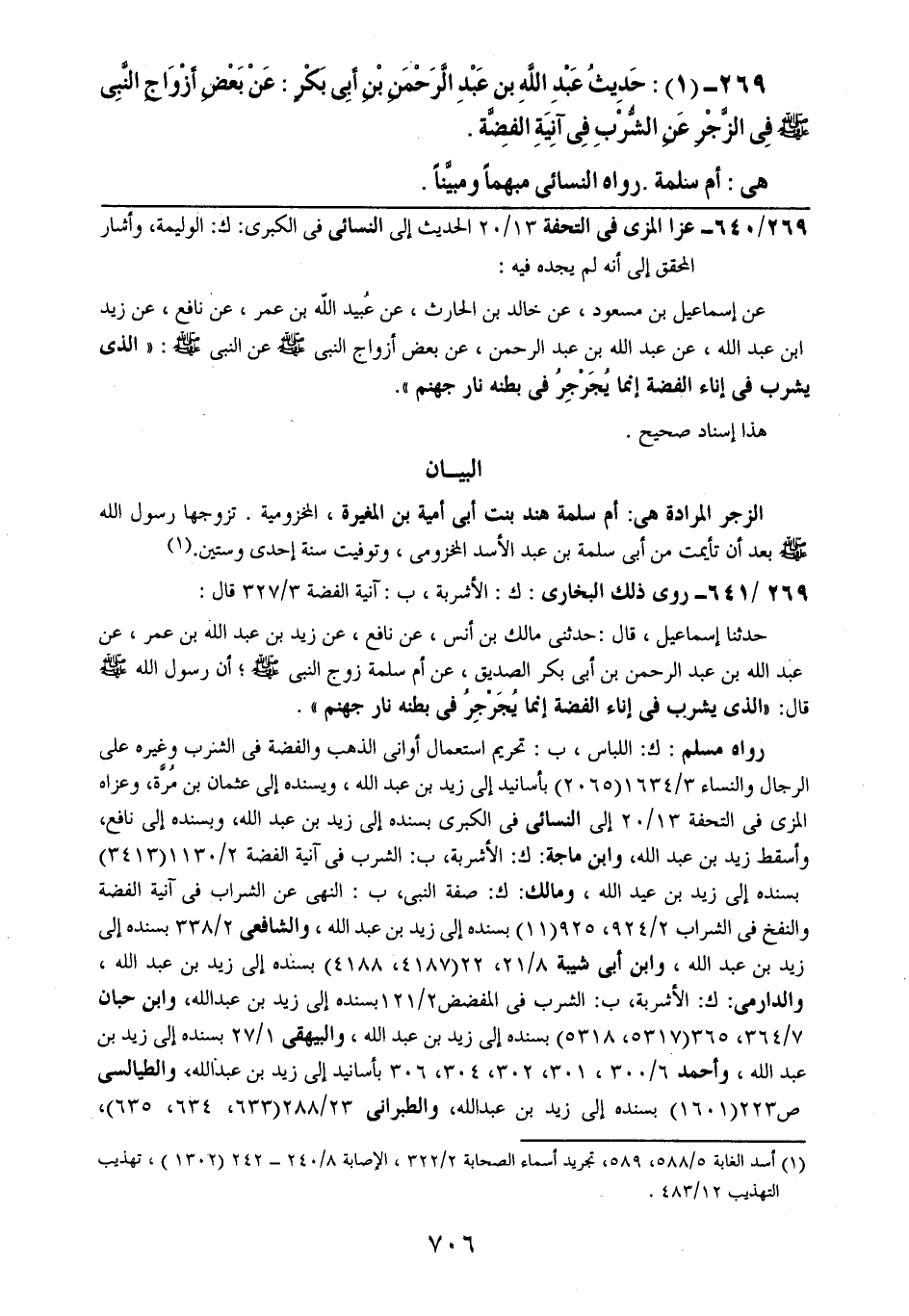 269- (1): حديث عبد الله بن عبد الرحمن بن أبي بكرٍ: عن بعض أزواج النبي صلى الله عليه وسلم في الزجر عن الشرب في آنية الفضة.