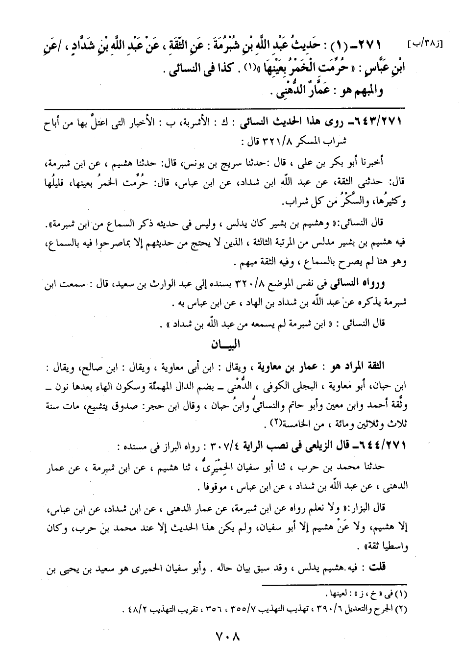 271- (1): حديث عبد الله بن شبرمة: عن الثقة، عن عبد الله بن شدادٍ، عن ابن عباسٍ: ((حرمت الخمر بعينها)). كذا في النسائي.