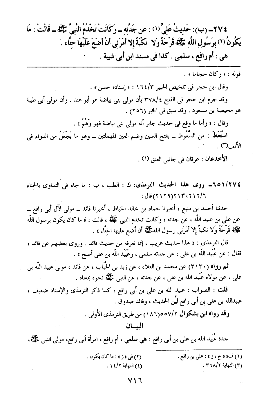 274- (ب): حديث علي: عن جدته-وكانت تخدم النبي صلى الله عليه وسلم- قالت: ما يكون برسول الله صلى الله عليه وسلم قرحةٌ ولا نكبةٌ إلا أمرني أن أضع عليها حناء.