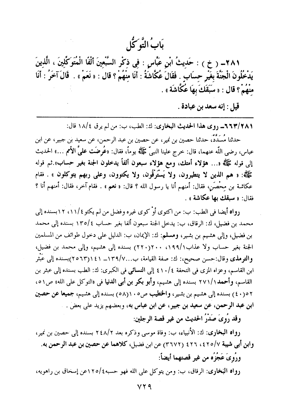 281- (خ): حديث ابن عباسٍ: في ذكر السبعين ألفاً المتوكلين، الذين يدخلون الجنة بغير حسابٍ. فقال عكاشة: أنا منهم؟ قال: ((نعم)). قال آخر: أنا منهم؟ قال: ((سبقك بها عكاشة)).