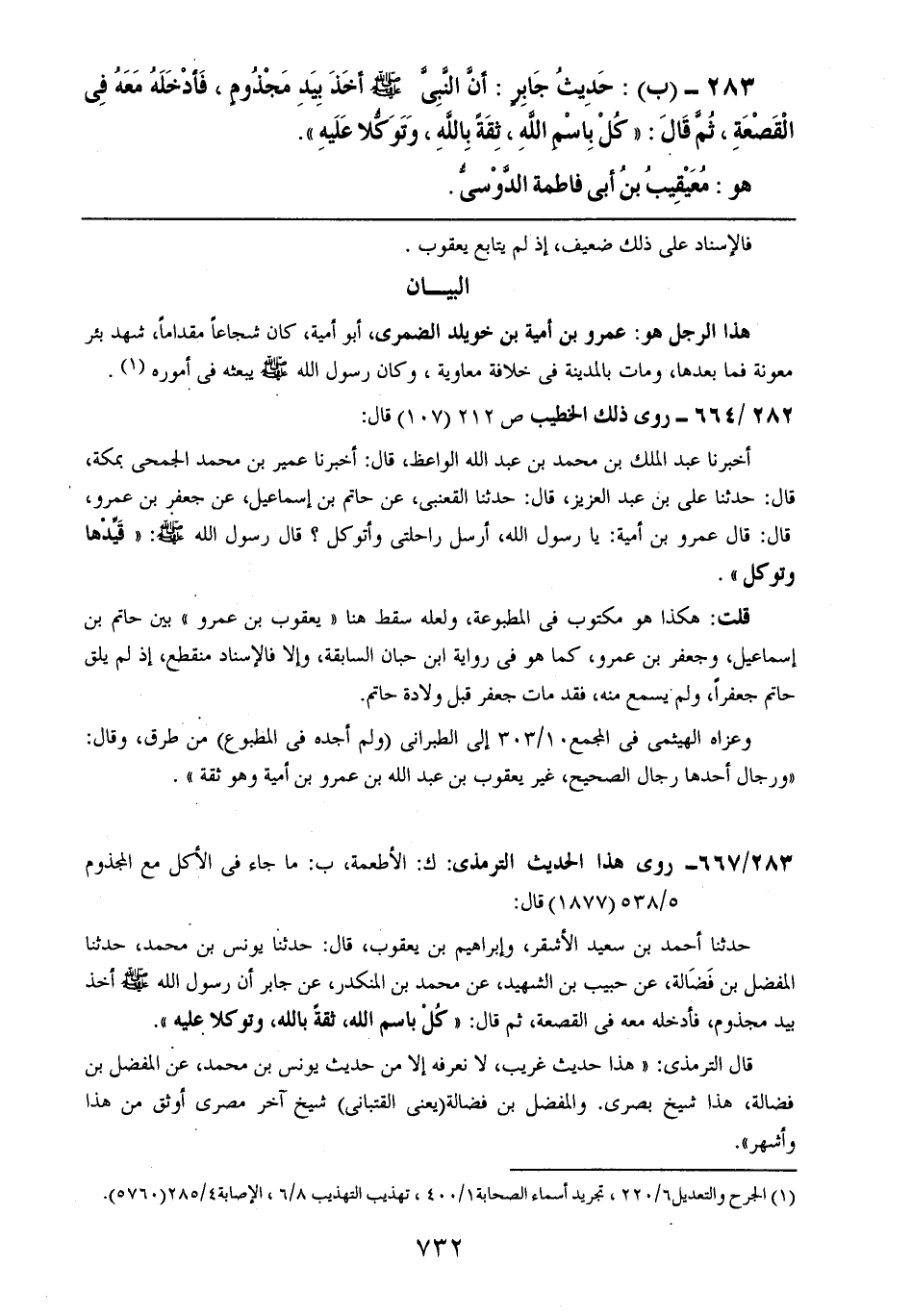 283- (ب): حديث جابرٍ: أن النبي صلى الله عليه وسلم أخذ بيد مجذومٍ، فأدخله معه في القصعة، ثم قال: ((كل باسم الله، ثقةً بالله، وتوكلاً عليه)).