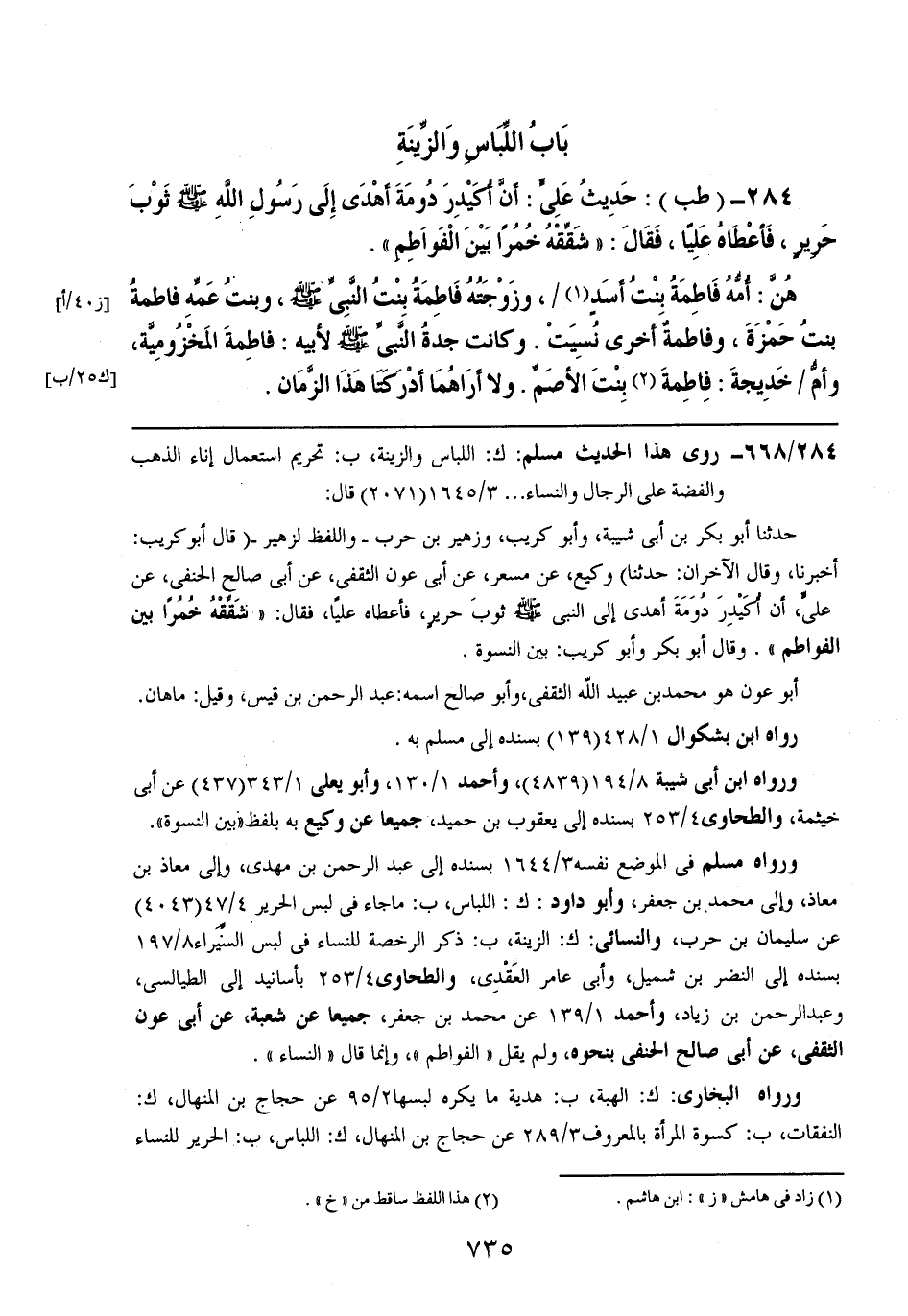 284- (طب): حديث علي: أن أكيدر دومة أهدى إلى رسول الله صلى الله عليه وسلم ثوب حريرٍ، فأعطاه علياً، فقال: ((شققه خمراً بين الفواطم)).