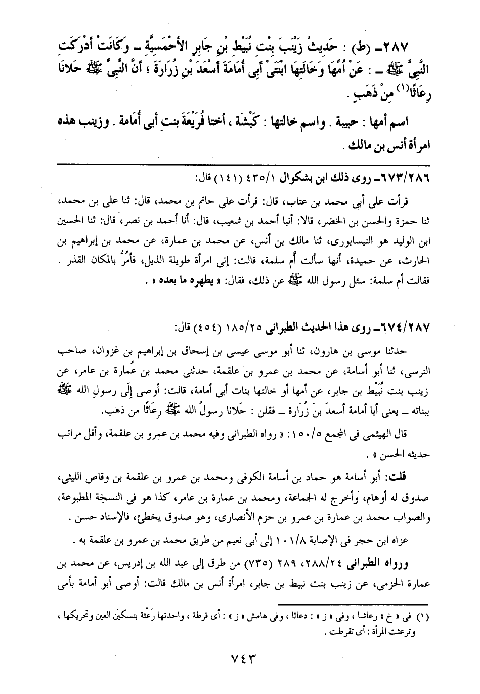 287- (ط): حديث زينب بنت نبيط بن جابرٍ الأحمسية -وكانت أدركت النبي صلى الله عليه وسلم-: عن أمها وخالتها ابنتي أبي أمامة أسعد بن زرارة؛ أن النبي صلى الله عليه وسلم حلانا رعاثاً من ذهبٍ.