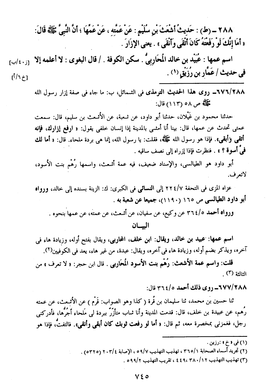 288- (ط): حديث أشعث بن سليمٍ: عن عمته، عن عمها؛ أن النبي صلى الله عليه وسلم قال: ((أما إنك لو رفعته كان أتقى وأنقى)). يعني الإزار.
