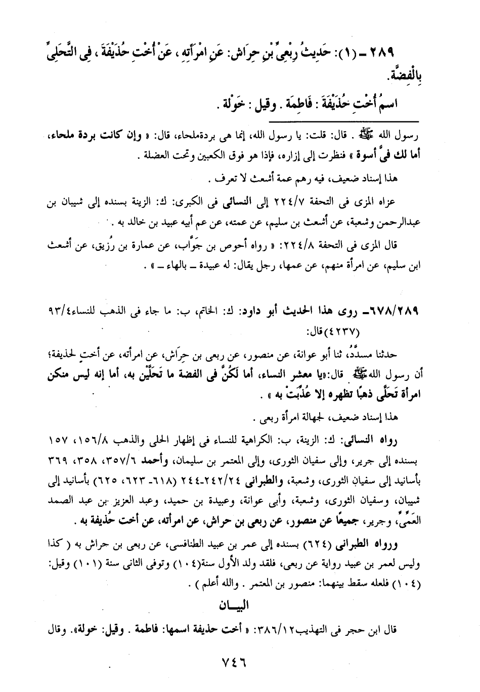 289- (1): حديث ربعي بن حراش: عن امرأته، عن أخت حذيفة، في التحلي بالفضة.