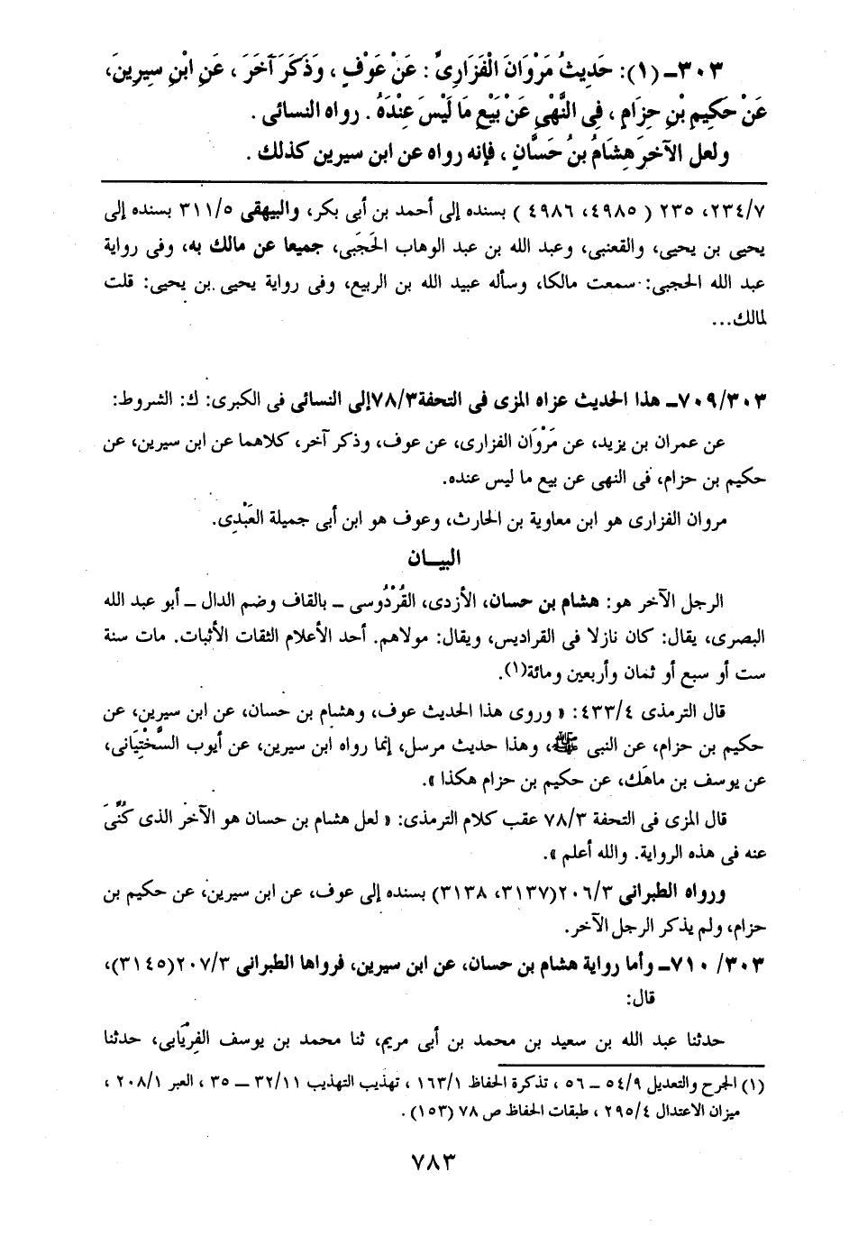 303- (1): حديث مروان الفزاري: عن عوفٍ، وذكر آخر، عن ابن سيرين، عن حكيم بن حزامٍ، في النهي عن بيع ما ليس عنده. رواه النسائي.