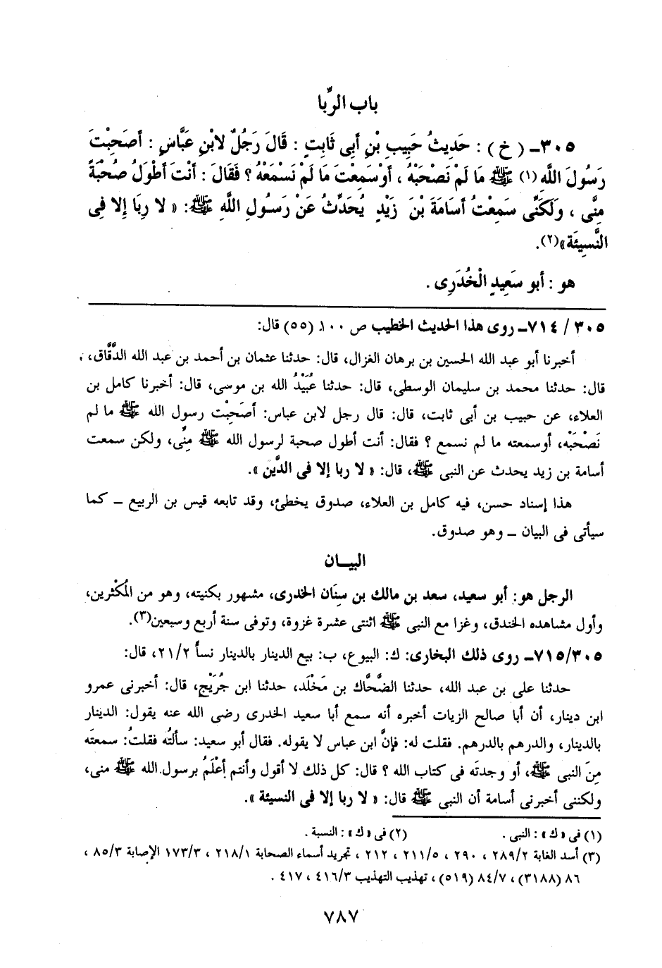 305 - (خ): حديث حبيب بن أبي ثابت: قال رجلٌ لابن عباس: أصحبت رسول الله صلى الله عليه وسلم ما لم نصحبه، أو سمعت ما لم نسمعه؟ فقال: أنت أطول صحبة مني، ولكني سمعت أسامة بن زيدٍ يحدث عن رسول الله صلى الله عليه وسلم: ((لا ربا إلا في النسيئة)).