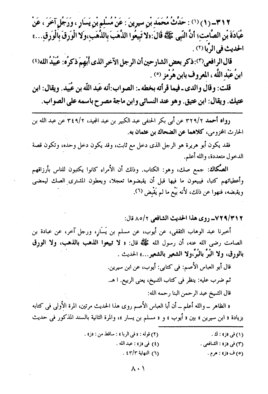 312- (1): حدث محمد بن سيرين: عن مسلمٍ بن يسارٍ، ورجلٍ آخر، عن عبادة بن الصامت؛ أن النبي صلى الله عليه وسلم قال: ((لا تبيعوا الذهب بالذهب، ولا الورق بالورق .. .. )) الحديث في الربا.