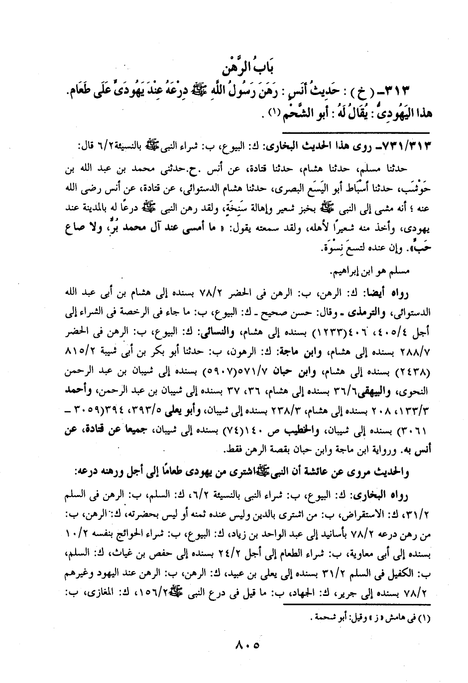 313- (خ): حديث أنسٍ: رهن رسول الله صلى الله عليه وسلم درعه عند يهوديٍ على طعام. هذا اليهودي: يقال له: أبو الشحم.