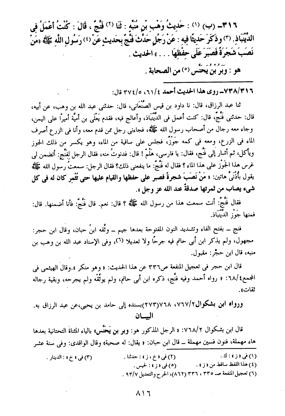 316- (ب): حديث وهب بن منبه: ثنا فنجٌ، قال: كنت أعمل في الدينباذ. وذكر حديثاً فيه: عن رجلٍ حدث فنجٌ بحديثٍ عن رسول الله صلى الله عليه وسلم ((من نصب شجرةً فصبر على حفظها .. .. .. )) الحديث.
