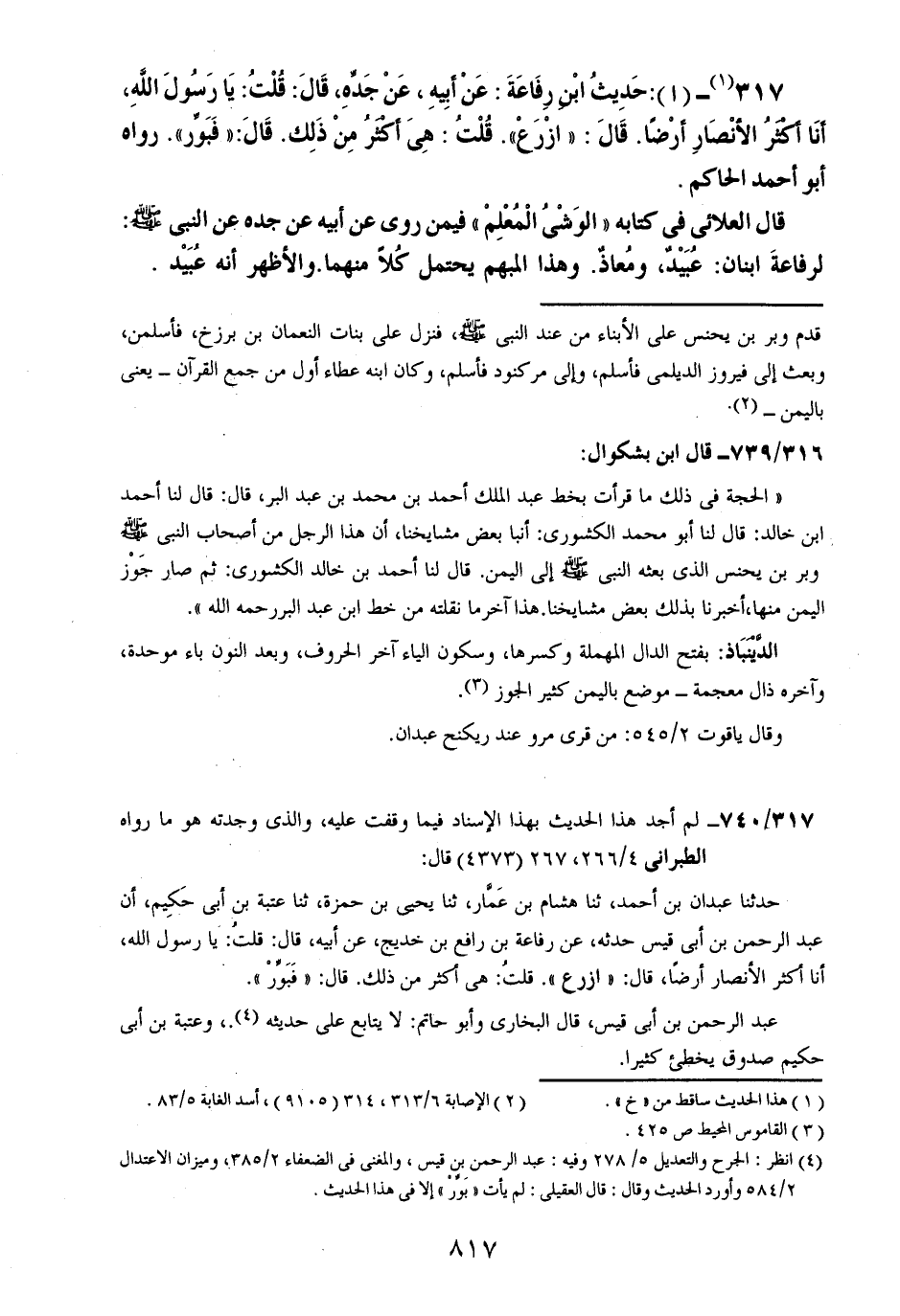 317- (1): حديث ابن رفاعة: عن أبيه، عن جده، قال: قلت: يا رسول الله، أنا أكثر الأنصار أرضاً. قال: ((ازرع)). قلت: هي أكثر من ذلك. قال: ((فبور)). رواه أبو أحمد الحاكم.