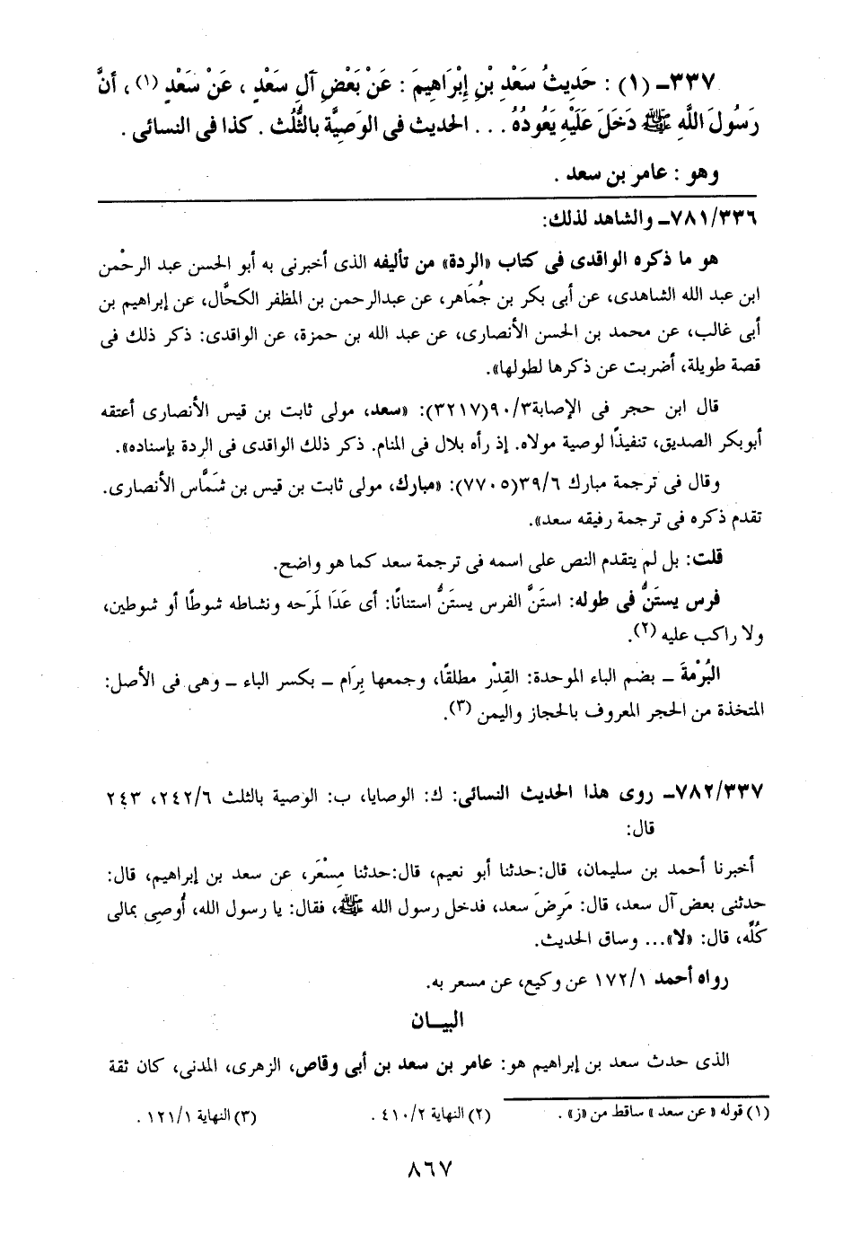 337- (1): حديث سعد بن إبراهيم: عن بعض آل سعدٍ، عن سعدٍ، أن رسول الله صلى الله عليه وسلم دخل عليه يعوده .. .. الحديث في الوصية بالثلث. كذا في النسائي.