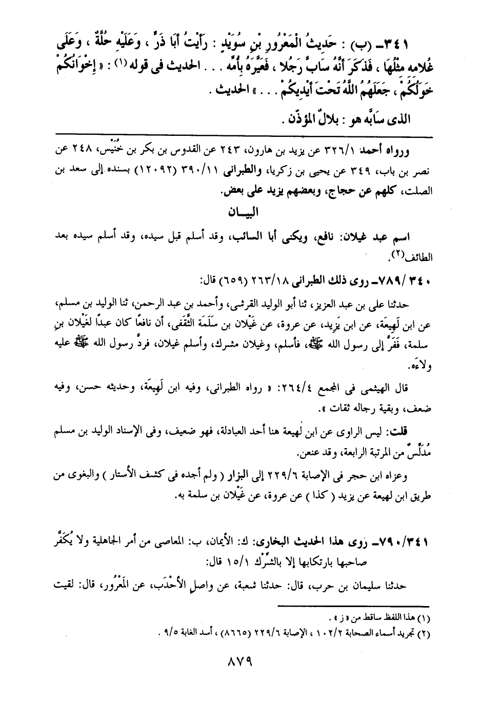 341- (ب): حديث المعرور بن سويدٍ: رأيت أبا ذر، وعليه حلةٌ، وعلى غلامه مثلها، فذكر أنه ساب رجلاً، فعيره بأمه .. .. الحديث في قوله: ((إخوانكم خولكم، جعلهم الله تحت أيديكم .. .. )) الحديث.