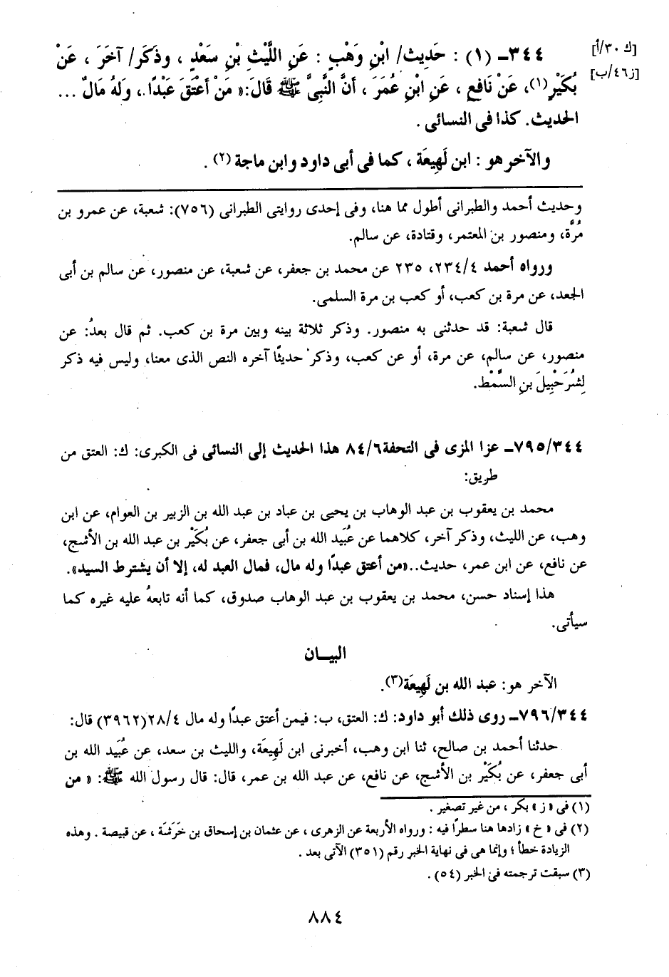 344- (1): حديث ابن وهبٍ: عن الليث بن سعدٍ، وذكر آخر، عن بكيرٍ، عن نافعٍ، عن ابن عمر، أن النبي صلى الله عليه وسلم قال: ((من أعتق عبداً، وله مالٌ .. .. الحديث. كذا في النسائي.