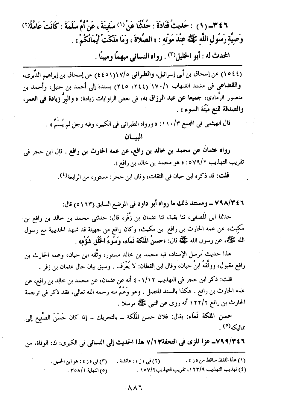 346- (1): حديث قتادة: حدثنا عن سفينة، عن أم سلمة: كانت عامة وصية رسول الله صلى الله عليه وسلم عند موته: ((الصلاة، وما ملكت أيمانكم)).