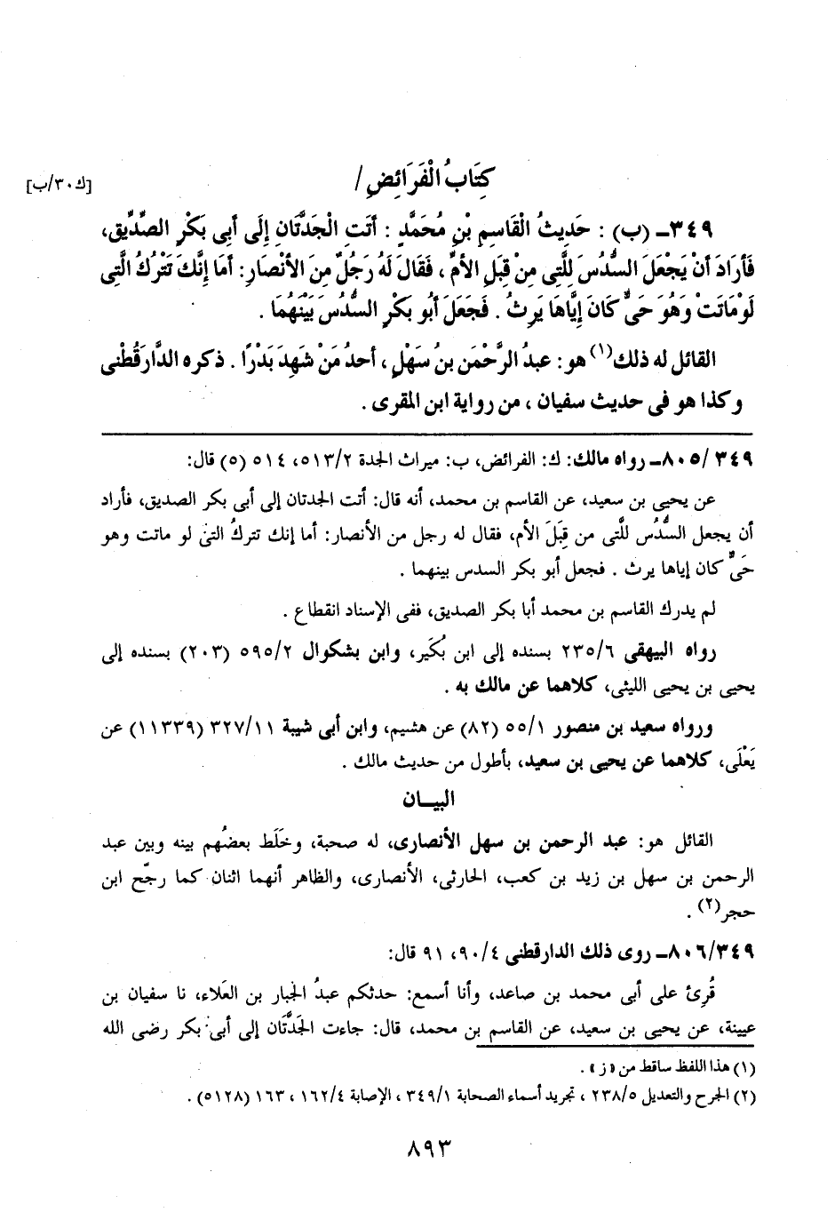 349- (ب): حديث القاسم بن محمدٍ: أتت الجدتان إلى أبي بكر الصديق، فأراد أن يجعل السدس للتي من قبل الأم، فقال له رجلٌ من الأنصار: أما إنك تترك التي لو ماتت وهي حيٌ كان إياها يرث. فجعل أبو بكر السدس بينهما.