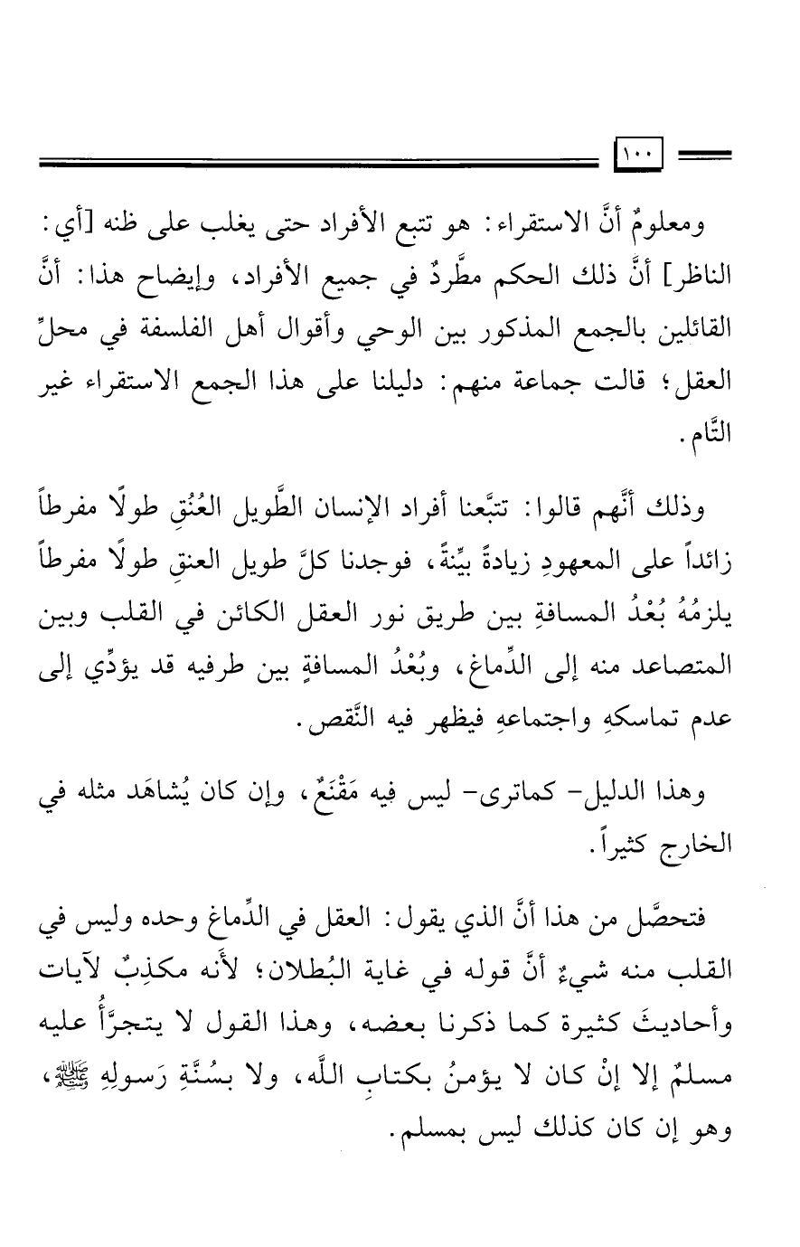 ومعلومٌ أنَّ الاستقراء: هو تتبع الأفراد حتى يغلب على ظنه [أي: الناظرٍ أن ذلك الحكم مطَردٌ في جميع الأفراد، وإيضاح هذا: أنَّ القائلين بالجمع المذكور بين الوحي وأقوال أهل الفلسفة في محل العقل؛ قالت جماعة منهم: دليلنا على هذا الجمع الاستقراء غير التام.