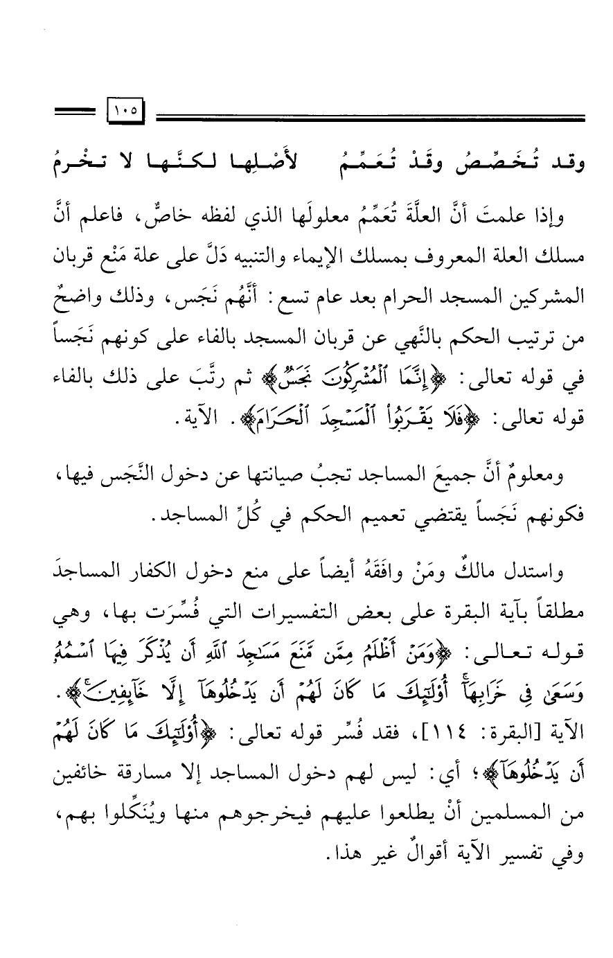 وإذا علمتَ أنَّ العلَّةَ تُعَمِّمُ معلولَها الذي لفظه خاصٌّ، فاعلم أنَّ مسلك العلة المعروف بمسلك الإيماء والتنبيه دَلَّ على علة مَنْع قربان المشركين المسجد الحرام بعد عام تسع: أنَّهُم نَجَس، وذلك واضحٌ من ترتيب الحكم بالنَّهي عن قربان المسجد بالفاء على كونهم نَجَسًا في قوله تعالى: {إِنَّمَا الْمُشْرِكُونَ نَجَسٌ} ثم رتَّبَ على ذلك بالفاء قوله تعالى: {فَلَا يَقْرَبُوا الْمَسْجِدَ الْحَرَامَ}. الآية.