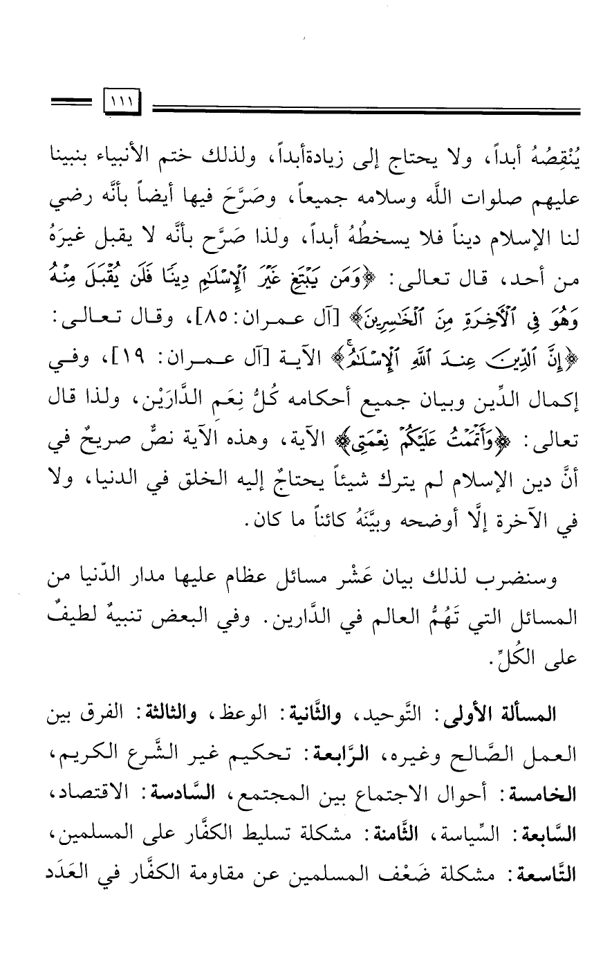 المسألة الأولى: التوحيد، والثانية: الوعظ، والثالثة: الفرق بين العمل الصَّالح وغيره، الرَّابعة: تحكيم غير الشرع الكريم، الخامسة: أحوال الاجتماع بين المجتمع، السَّادسة: الاقتصاد، السابعة: السِّياسة، الثامنة: مشكلة تسليط الكفَّار على المسلمين، التَّاسعة: مشكلة ضَعْف المسلمين عن مقاومة الكفار في العَدَد