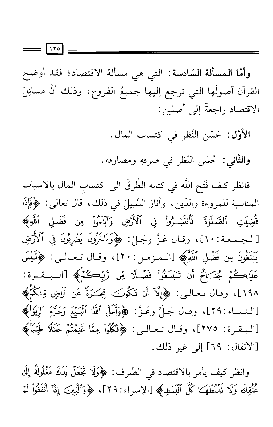 وأمَّا المسألة السّادسة: التي هي مسألة الاقتصاد؛ فقد أوضحَ القرآن أصولَها التي ترجع إليها جميعُ الفروع، وذلك أنَّ مسائِلَ الاقتصاد راجعةٌ إلى أصلين: