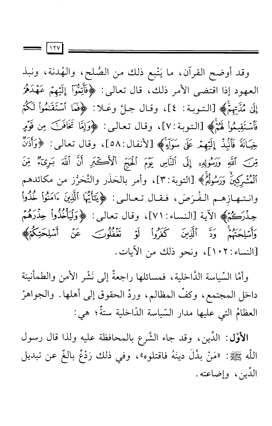 وقد أوضح القرآن، ما يَتْبع ذلك من الصُّلح، والهُدنة، ونبذ العهود إذا اقتضى الأمر ذلك، قال تعالى: {فَأَتِمُّوا إِلَيْهِمْ عَهْدَهُمْ إِلَى مُدَّتِهِمْ} [التوبة: 4] , وقال جلَّ وعَلا: {فَمَا اسْتَقَامُوا لَكُمْ فَاسْتَقِيمُوا لَهُمْ} [التوبة: 7] , وقال تعالى: {وَإِمَّا تَخَافَنَّ مِنْ قَوْمٍ خِيَانَةً فَانْبِذْ إِلَيْهِمْ عَلَى سَوَاءٍ} [الأنفال: 58] , وقال تعالى: {وَأَذَانٌ مِنَ اللَّهِ وَرَسُولِهِ إِلَى النَّاسِ يَوْمَ الْحَجِّ الْأَكْبَرِ أَنَّ اللَّهَ بَرِيءٌ مِنَ الْمُشْرِكِينَ وَرَسُولُهُ} [التوبة: 3] , وأمر بالحَذَر والتَّحَرُّز من مكائدهم وانتهازِهم الفُرَصَ، فقال تعالى: {يَاأَيُّهَا الَّذِينَ آمَنُوا خُذُوا حِذْرَكُمْ} الآية [النساء: 71] , وقال تعالى: {وَلْيَأْخُذُوا حِذْرَهُمْ وَأَسْلِحَتَهُمْ وَدَّ الَّذِينَ كَفَرُوا لَوْ تَغْفُلُونَ عَنْ أَسْلِحَتِكُمْ} [النساء: 102] , ونحو ذلك من الآيات.