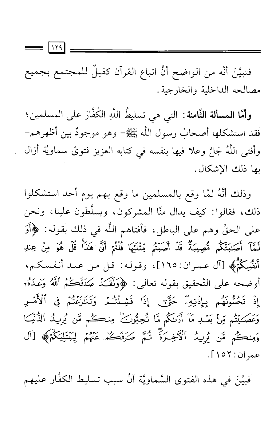 وأمَّا المسألة الثَّامنة: التي هي تسليطُ اللهِ الكُفَّارَ على المسلمين؛ فقد استشكلها أصحابُ رسول الله - صلى الله عليه وسلم - وهو موجودٌ بين أظهرهم - وأفتى اللهُ جَلَّ وعلا فيها بنفسه في كتابه العزيز فتوىً سماوية أزال بها ذلك الإشكال.