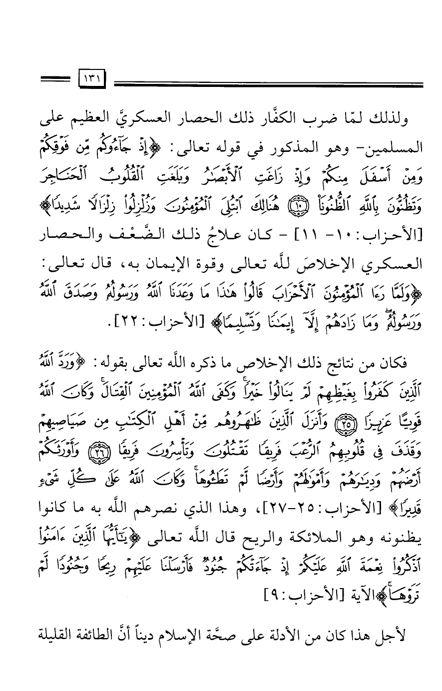 ولذلك لمّا ضرب الكفار ذلك الحصار العسكريَّ العظيم على المسلمين -وهو المذكور في قوله تعالى: {إِذْ جَاءُوكُمْ مِنْ فَوْقِكُمْ وَمِنْ أَسْفَلَ مِنْكُمْ وَإِذْ زَاغَتِ الْأَبْصَارُ وَبَلَغَتِ الْقُلُوبُ الْحَنَاجِرَ وَتَظُنُّونَ بِاللَّهِ الظُّنُونَا (10) هُنَالِكَ ابْتُلِيَ الْمُؤْمِنُونَ وَزُلْزِلُوا زِلْزَالًا شَدِيدًا} [الأحزاب: 10 - 11]- كان علاجُ ذلك الضَّعْف والحصار العسكري الإخلاصَ لله تعالى وقوة الإيمان به، قال تعالى: {وَلَمَّا رَأَى الْمُؤْمِنُونَ الْأَحْزَابَ قَالُوا هَذَا مَا وَعَدَنَا اللَّهُ وَرَسُولُهُ وَصَدَقَ اللَّهُ وَرَسُولُهُ وَمَا زَادَهُمْ إِلَّا إِيمَانًا وَتَسْلِيمًا} [الأحزاب: 22].