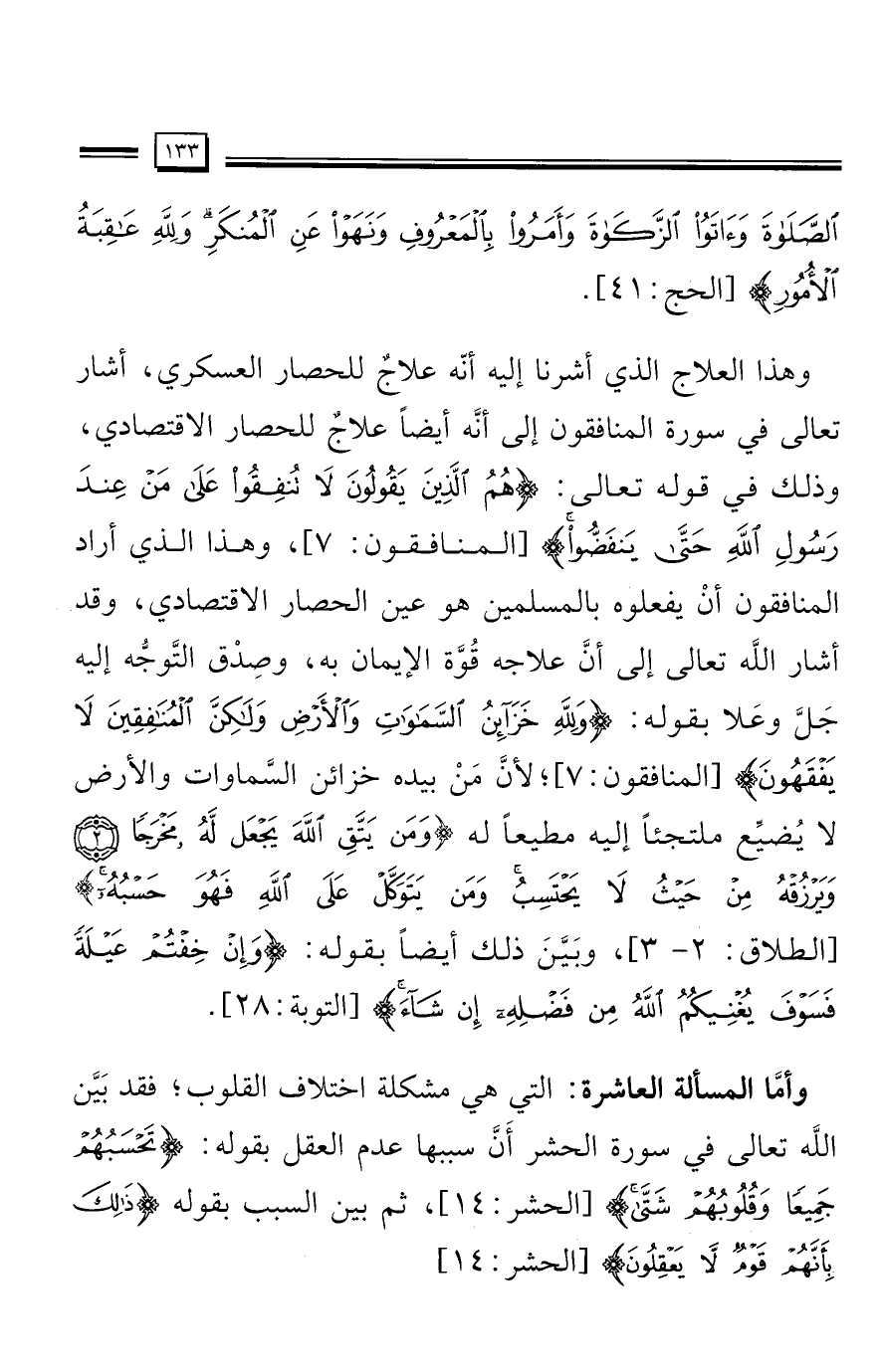 وهذا العلاج الذي أشرنا إليه أنَّه علاجٌ للحصار العسكري، أشار تعالى في سورة المنافقون إلى أنَّه أَيضًا علاجٌ للحصار الاقتصادي، وذلك في قوله تعالى: {هُمُ الَّذِينَ يَقُولُونَ لَا تُنْفِقُوا عَلَى مَنْ عِنْدَ رَسُولِ اللَّهِ حَتَّى يَنْفَضُّوا} [المنافقون: 7] , وهذا الذي أراد المنافقون أنْ يفعلوه بالمسلمين هو عين الحصار الاقتصادي، وقد أشار الله تعالى إلى أنَّ علاجه قُوَّة الإيمان به، وصِدْق التَّوجُّه إليه جَلَّ وعَلا بقوله: {وَلِلَّهِ خَزَائِنُ السَّمَاوَاتِ وَالْأَرْضِ وَلَكِنَّ الْمُنَافِقِينَ لَا يَفْقَهُونَ} [المنافقون: 7]؛ لأن مَن بيده خزائن السَّماوات والأرض لا يُضيِّع ملتجئًا إليه مطيعًا له {وَمَنْ يَتَّقِ اللَّهَ يَجْعَلْ لَهُ مَخْرَجًا (2) وَيَرْزُقْهُ مِنْ حَيْثُ لَا يَحْتَسِبُ وَمَنْ يَتَوَكَّلْ عَلَى اللَّهِ فَهُوَ حَسْبُهُ} [الطلاق: 2 - 3] , وبَيَّنَ ذلك أَيضًا بقوله: {وَإِنْ خِفْتُمْ عَيْلَةً فَسَوْفَ يُغْنِيكُمُ اللَّهُ مِنْ فَضْلِهِ إِنْ شَاءَ} [التوبة: 28].