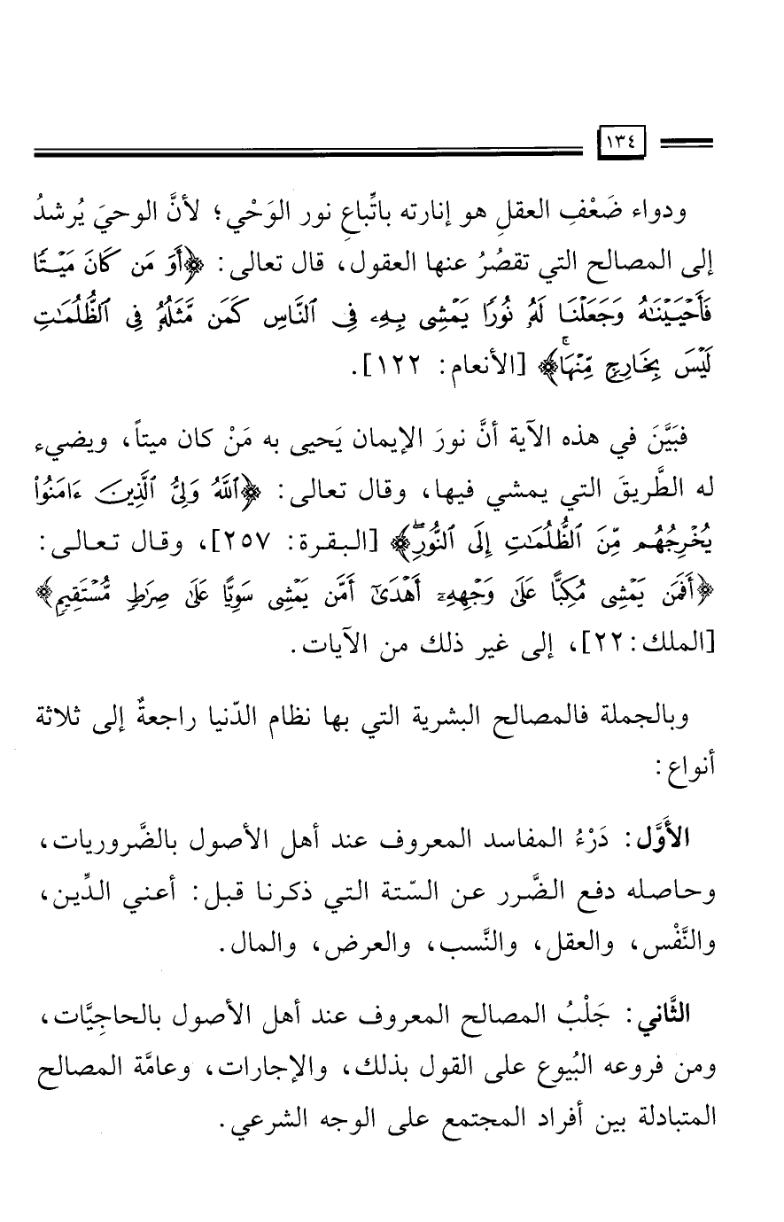 الأَوَّل: دَرْءُ المفاسد المعروف عند أهل الأصول بالضَّروريات، وحاصله دفع الضرر عن السّتة التي ذكرنا قبل: أعني الدين، والنَّفْس، والعقل، والنَّسب، والعرض، والمال.
