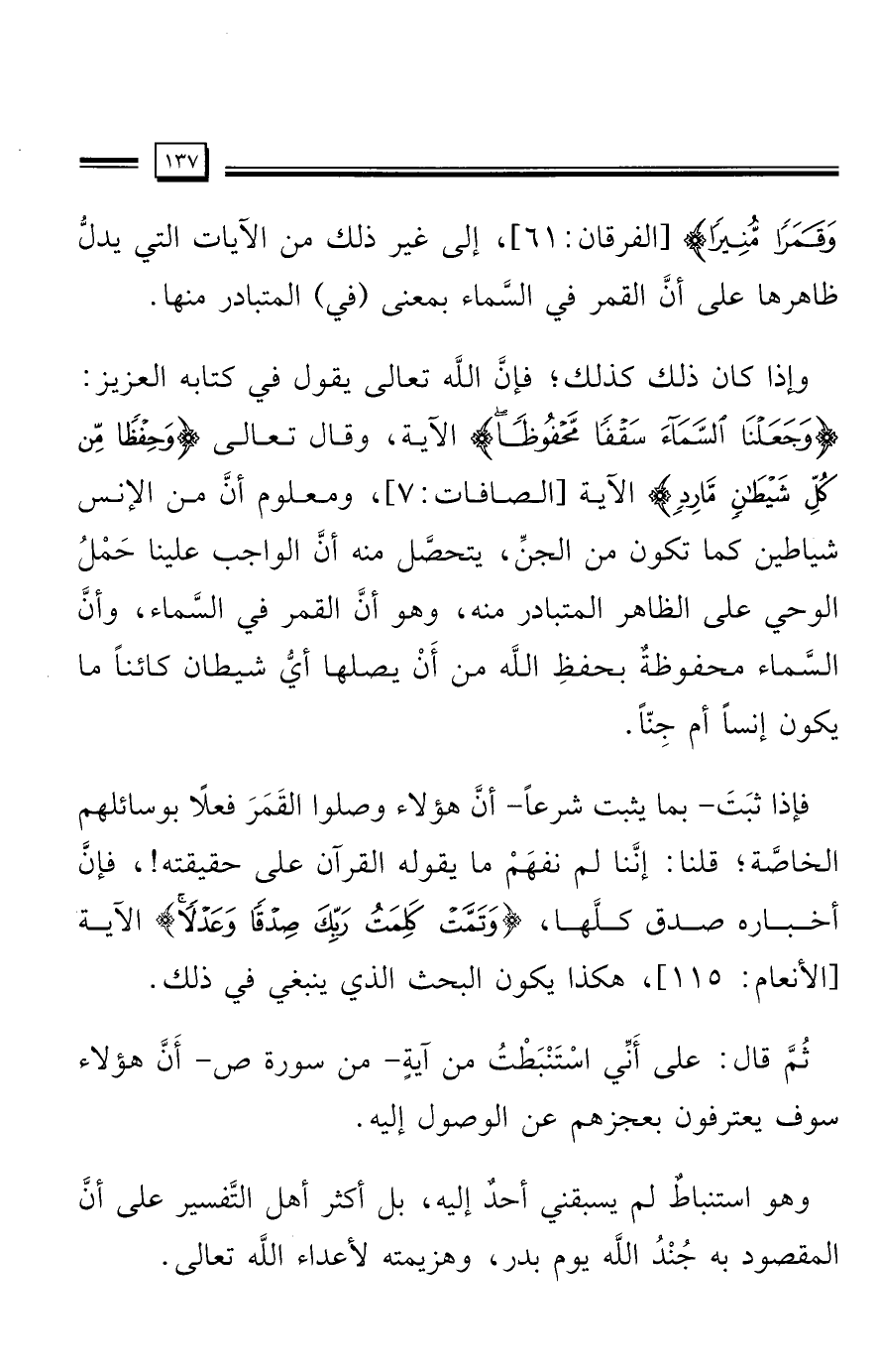 فإذا ثبَتَ -بما يثبت شرعًا- أنَّ هؤلاء وصلوا القَمَرَ فعلًا بوسائلهم الخاصَّة؛ قلنا: إنَّنا لم نفهَمْ ما يقوله القرآن على حقيقته!، فإنَّ أخباره صدق كلَّها، {وَتَمَّتْ كَلِمَتُ رَبِّكَ صِدْقًا وَعَدْلًا} الآية [الأنعام: 115] , هكذا يكون البحث الذي ينبغي في ذلك.