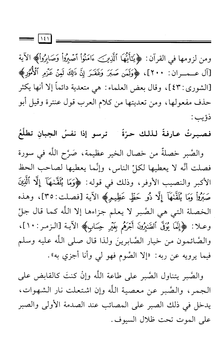 ومن لزومها في القرآن: {يَاأَيُّهَا الَّذِينَ آمَنُوا اصْبِرُوا وَصَابِرُوا} الآية [آل عمران: 200] , {وَلَمَنْ صَبَرَ وَغَفَرَ إِنَّ ذَلِكَ لَمِنْ عَزْمِ الْأُمُورِ} [الشورى: 43] , وقال بعض العلماء: هي متعدية دائمًا إلَّا أنها يكثر حذف مفعولها، ومن تعديتها من كلام العرب قول عنترة وقيل أبو ذؤيب: