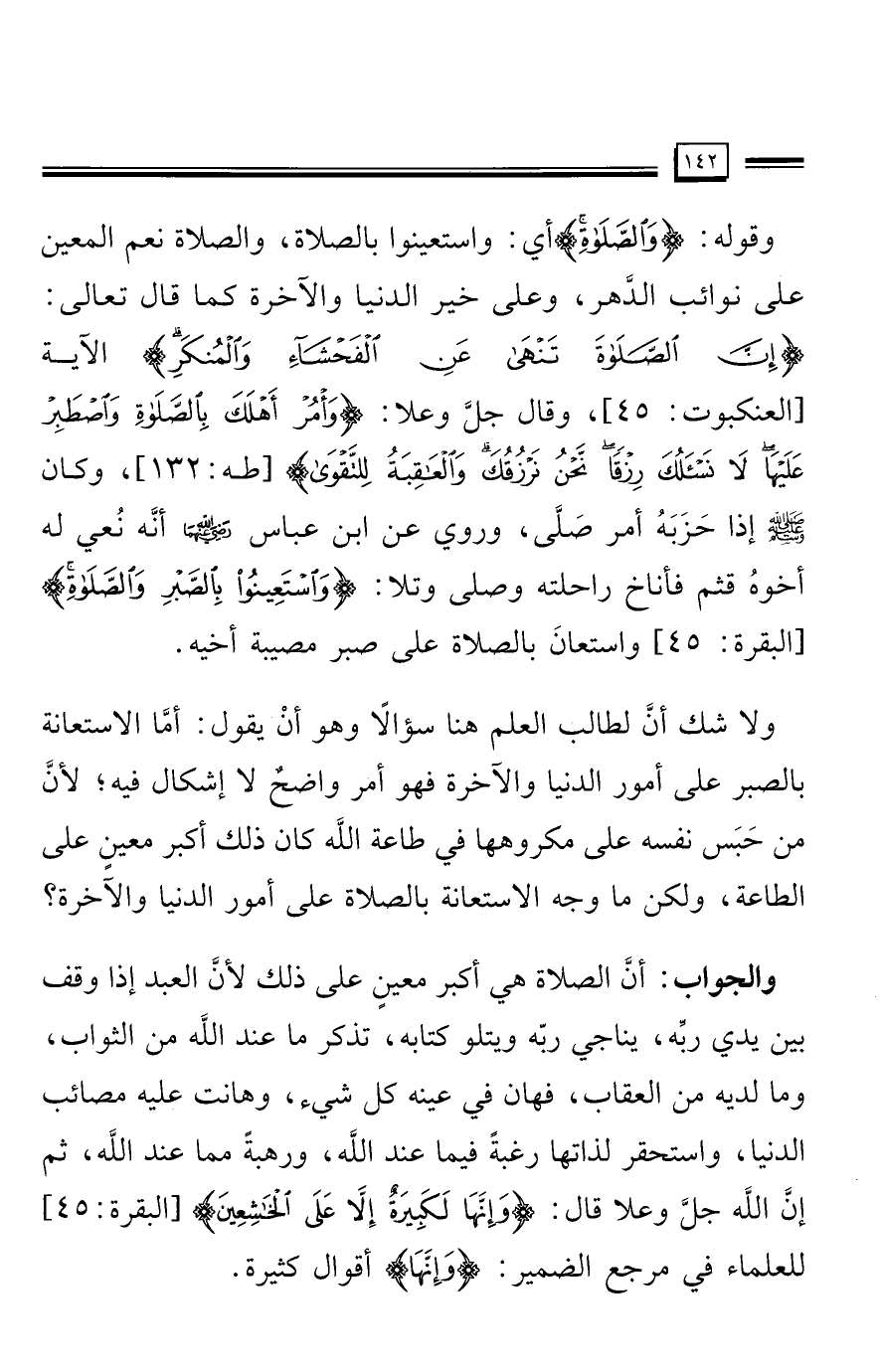 والجواب: أنَّ الصلاة هي أكبر معينِ على ذلك لأن العبد إذا وقف بين يدي ربه، يناجي ربّه ويتلو كتابه، تذكر ما عند الله من الثواب، وما لديه من العقاب، فهان في عينه كل شيء، وهانت عليه مصائب الدنيا، واستحقر لذاتها رغبةً فيما عند الله، ورهبةً مما عند الله، ثم إن الله جلَّ وعلا قال: {وَإِنَّهَا لَكَبِيرَةٌ إِلَّا عَلَى الْخَاشِعِينَ} [البقرة: 45] للعلماء في مرجع الضمير: {وَإِنَّهَا} أقوال كثيرة.